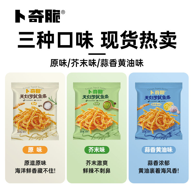 卜奇脆脆皮鱿鱼条原味芥末蒜香黄油味天妇罗鱿鱼丝零食18g*9袋