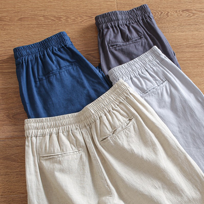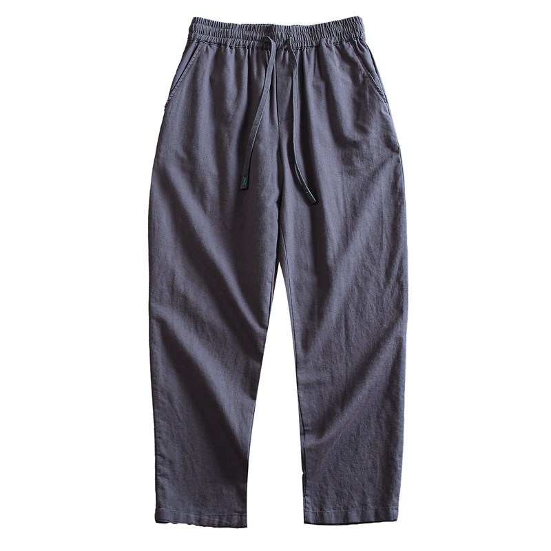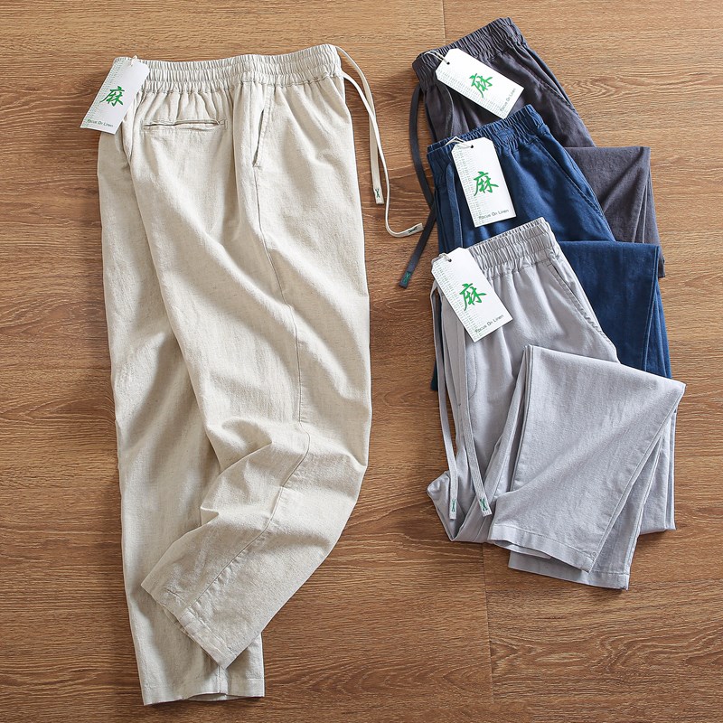 天然细腻纯亚麻 夏季男士直筒宽松纯色松紧腰薄款透气麻长裤 男裤