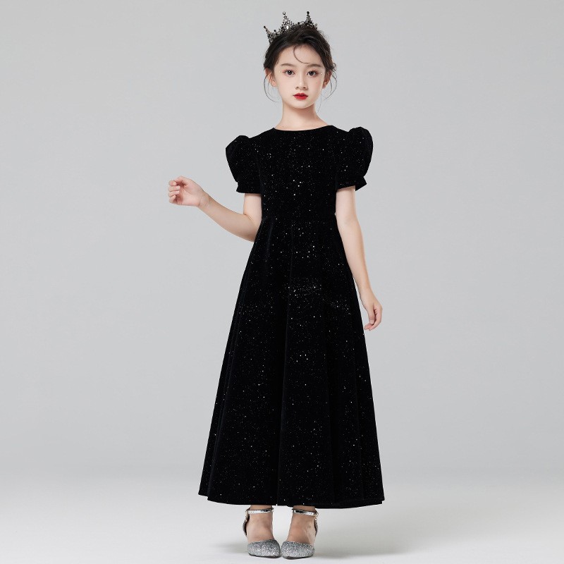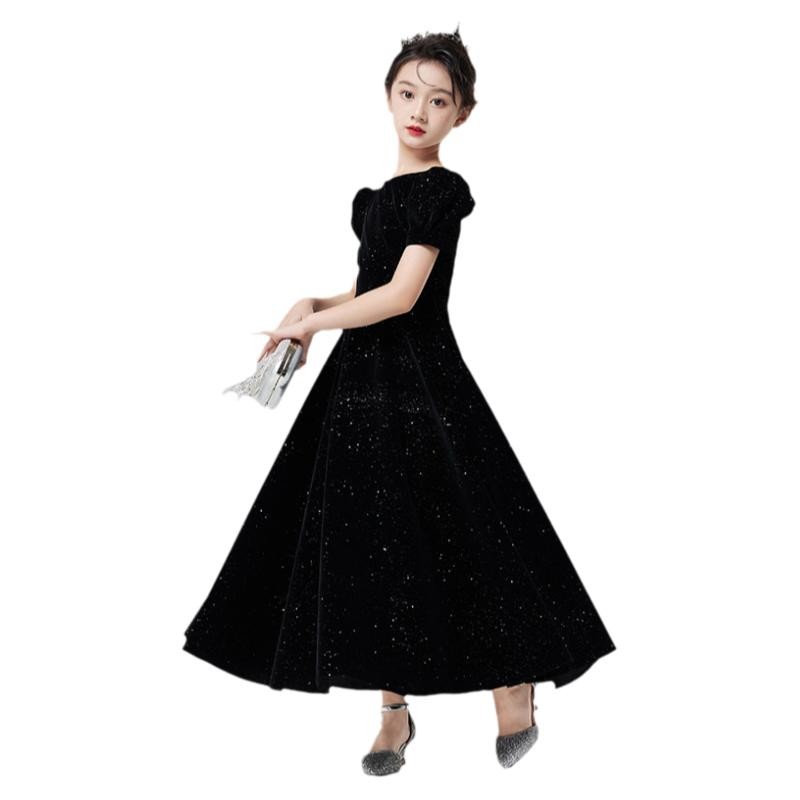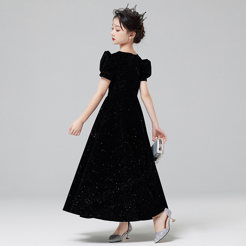 洋气时尚儿童高端黑色礼服长裙女童泡泡袖公主连衣裙子钢琴演出服