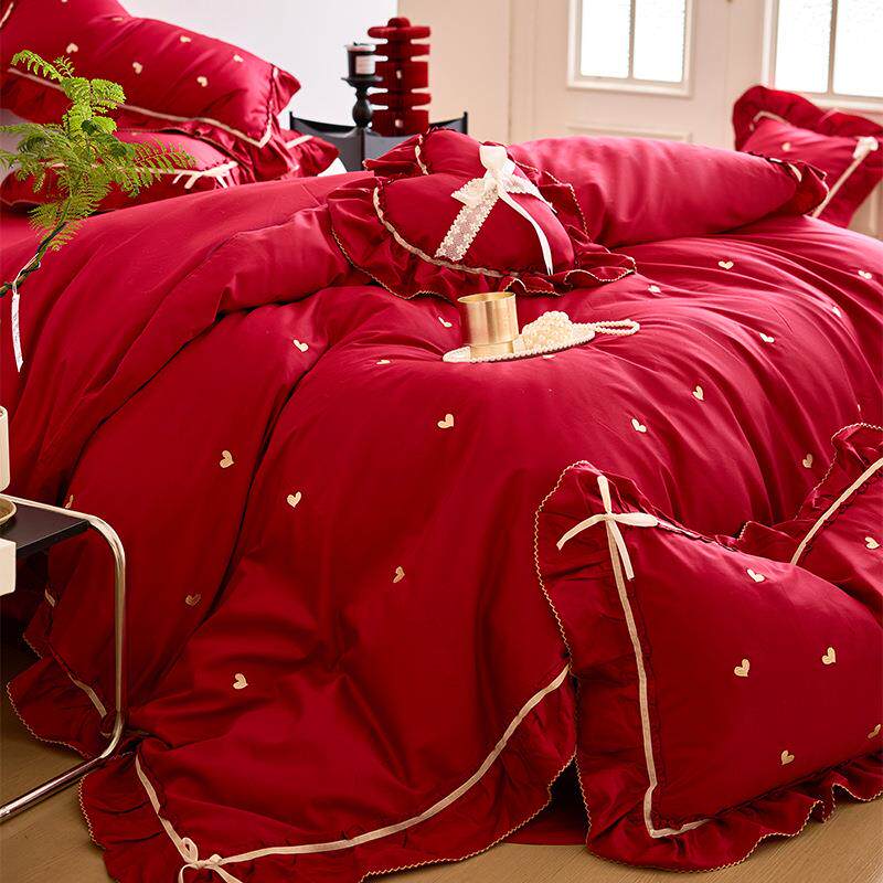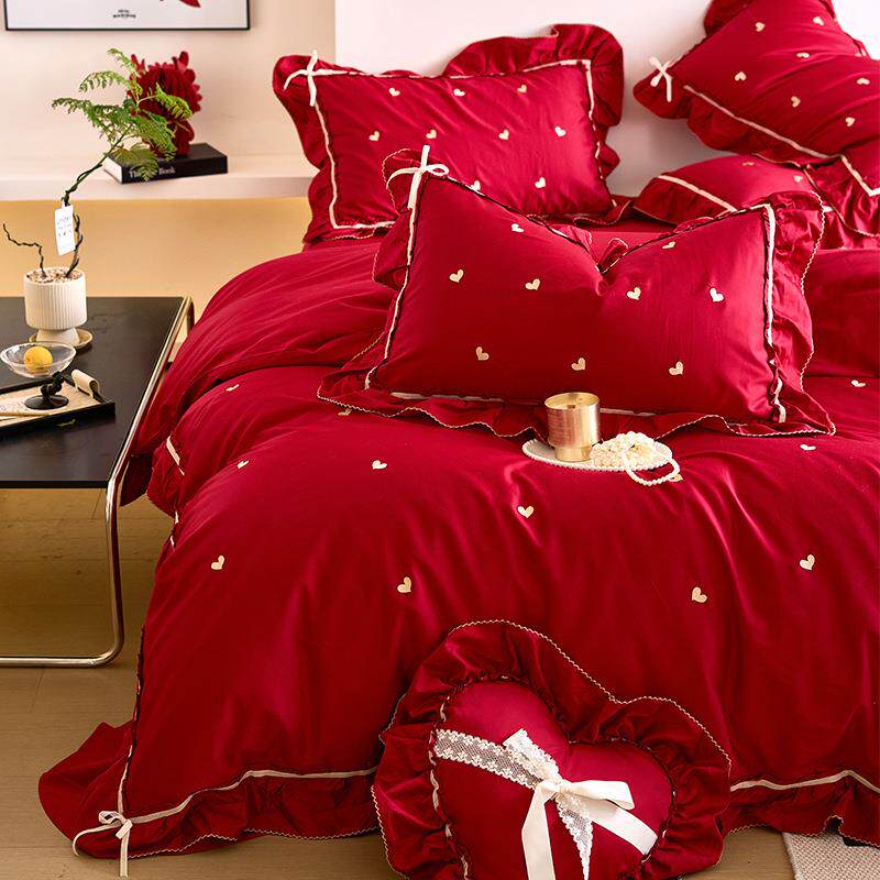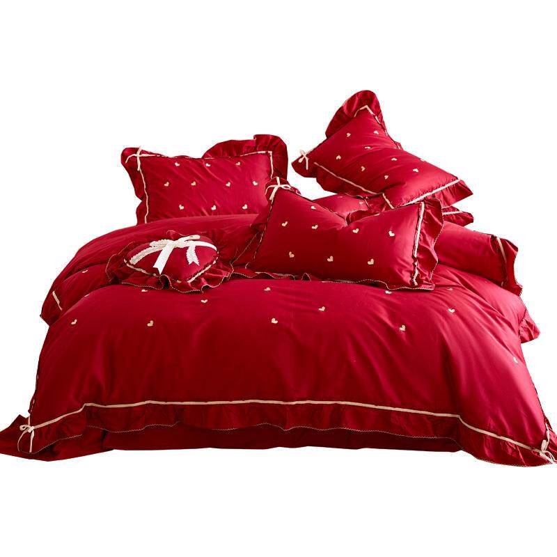刺0绣小爱心婚庆四件全棉10Y19支长绒棉套红色花结边婚被套床单床