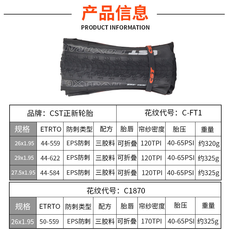 CST正新CFT1超轻防刺山地车轮胎竞赛折叠山马外胎26/27.5/29*1.95