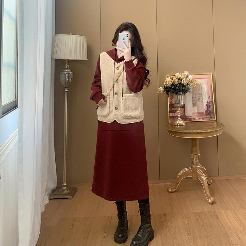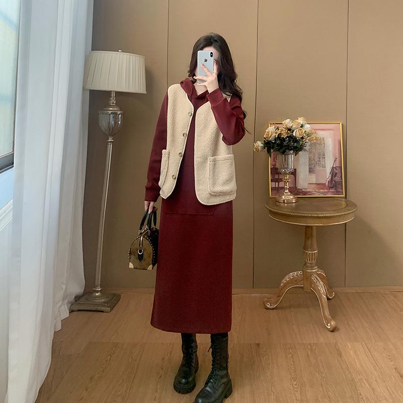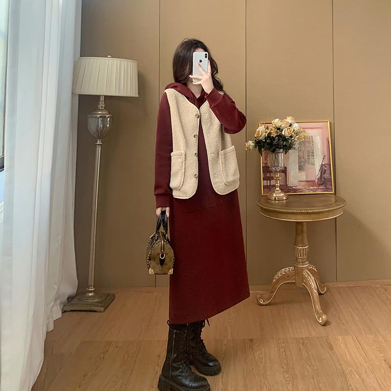 加厚加绒秋冬新款羊羔毛马甲套装女连帽长裙两件套大码胖MM女显瘦