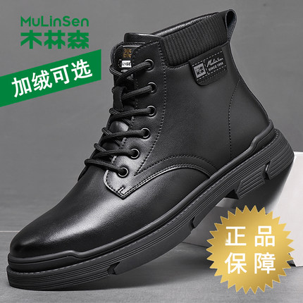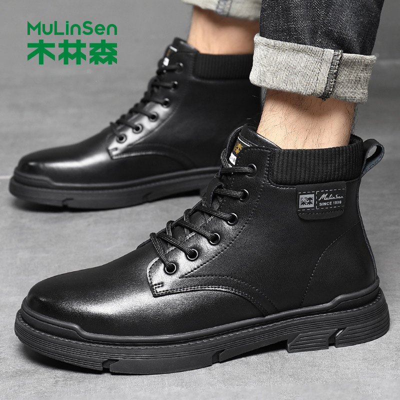 木林森马丁靴男款秋季英伦真皮黑色机车皮靴厚底休闲高帮工装男靴