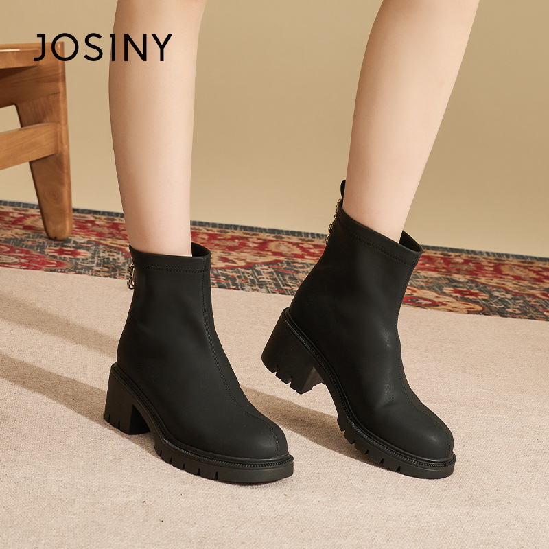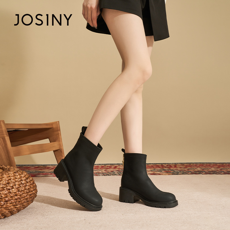 卓诗尼冬季女士短筒靴子圆头平跟后拉链时装休闲百搭通勤切尔西