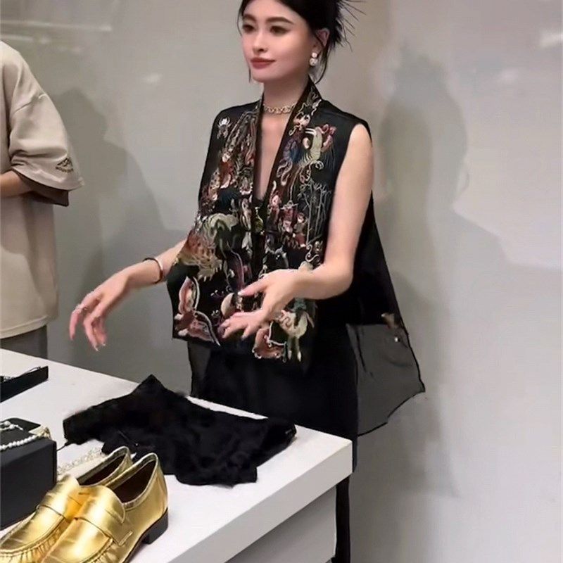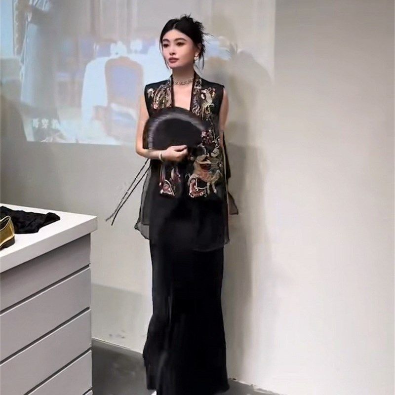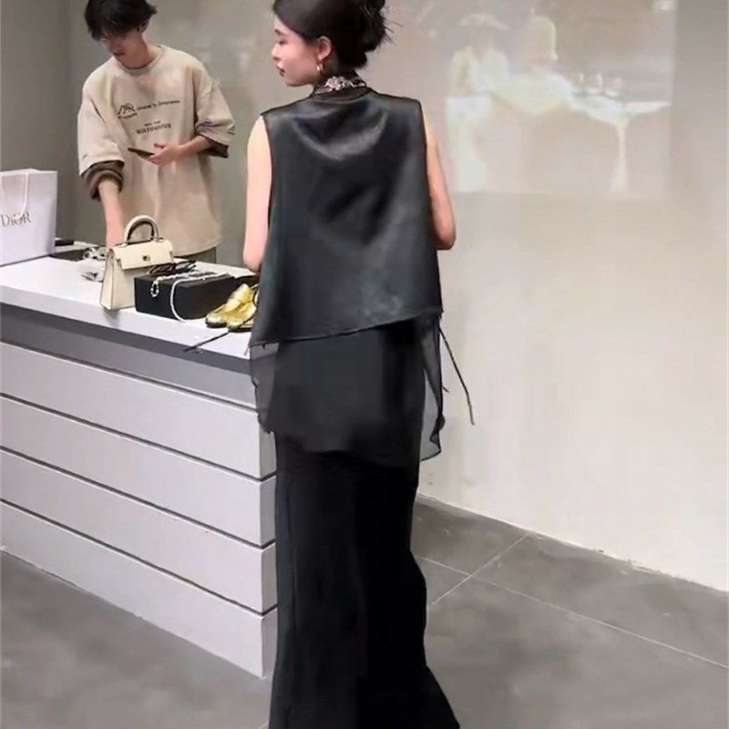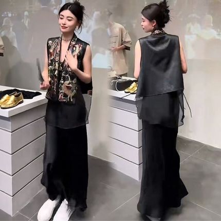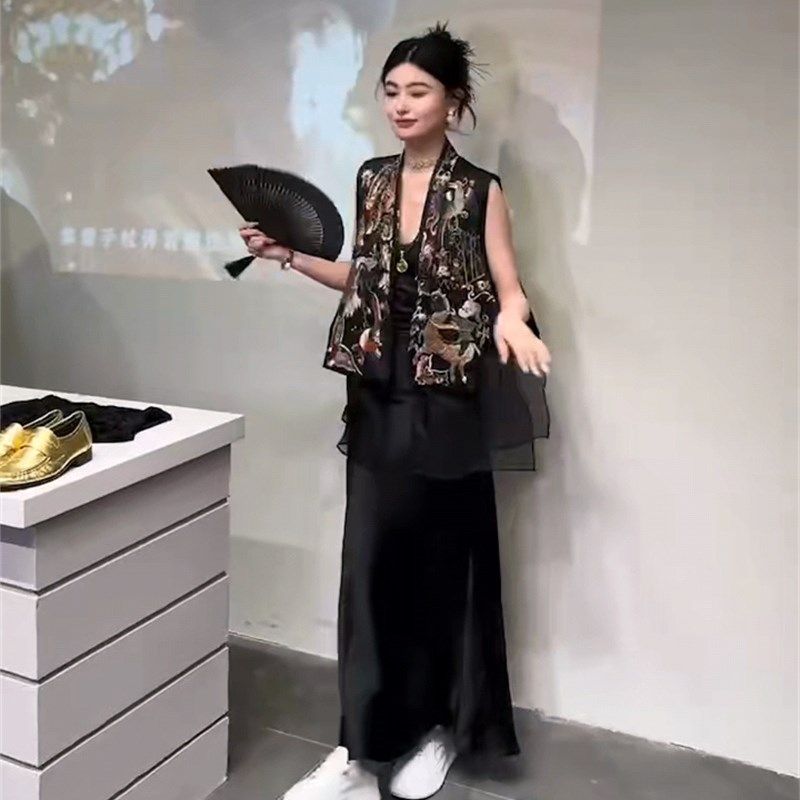 新中式时尚套装女夏季洋气设计感无袖马甲开衫上衣半身长裙两件套