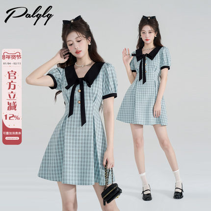 蓝色学院风娃娃领短袖格子连衣裙女夏季甜美设计感气质收腰a字裙