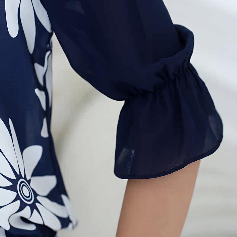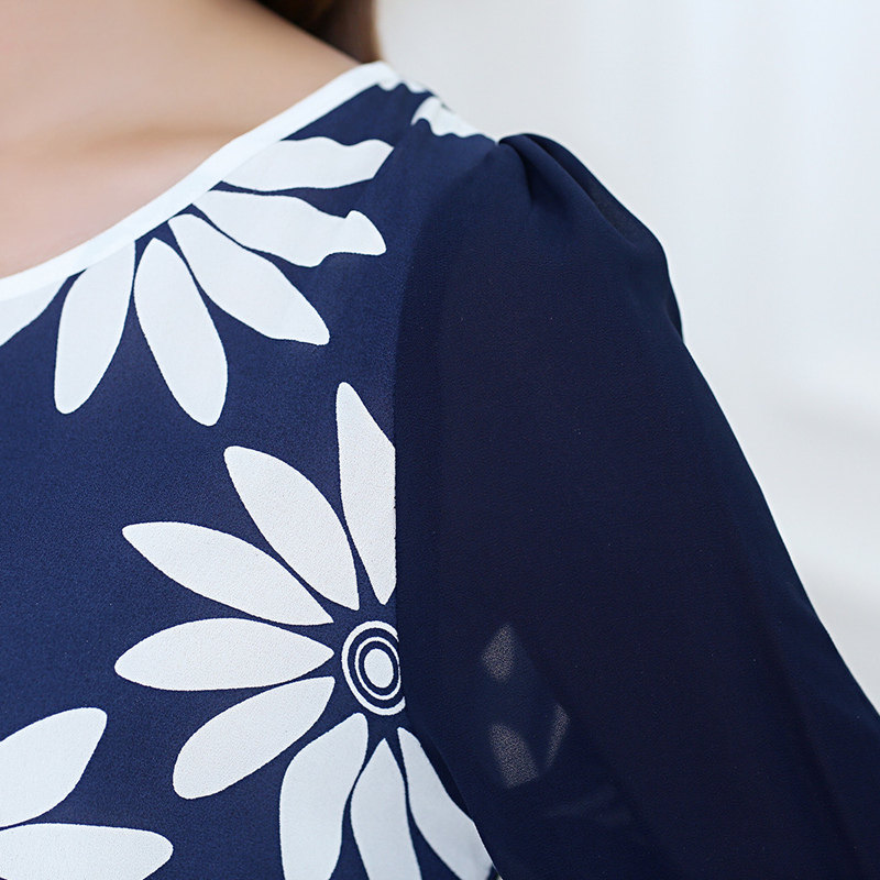 纤雯春夏中长款圆领印花雪纺衫女松紧腰显瘦大码女装中袖上衣小衫