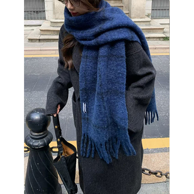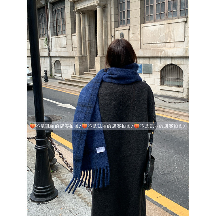 高级深海蓝!羊毛混纺格子围巾女冬保暖加厚清冷氛围感披肩围脖男