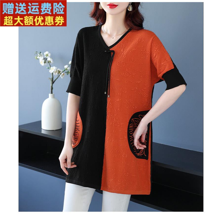 妈妈装大码女桑蚕丝针织T恤夏季新款宽松遮屁股中长款冰丝打底衫