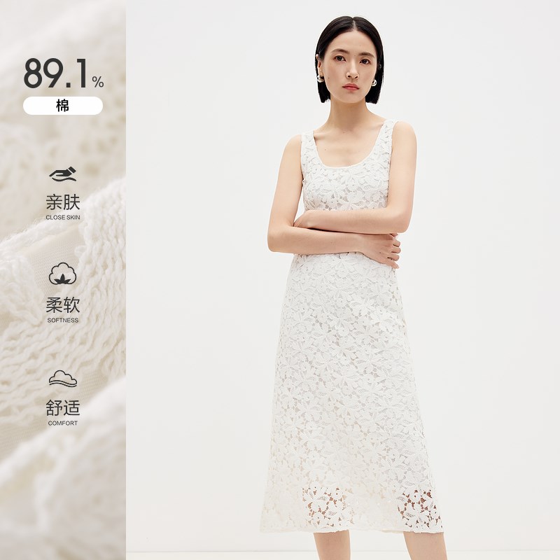 水云间白色u领背心连衣裙女无袖钩花蕾丝直筒中长裙子2025夏新款