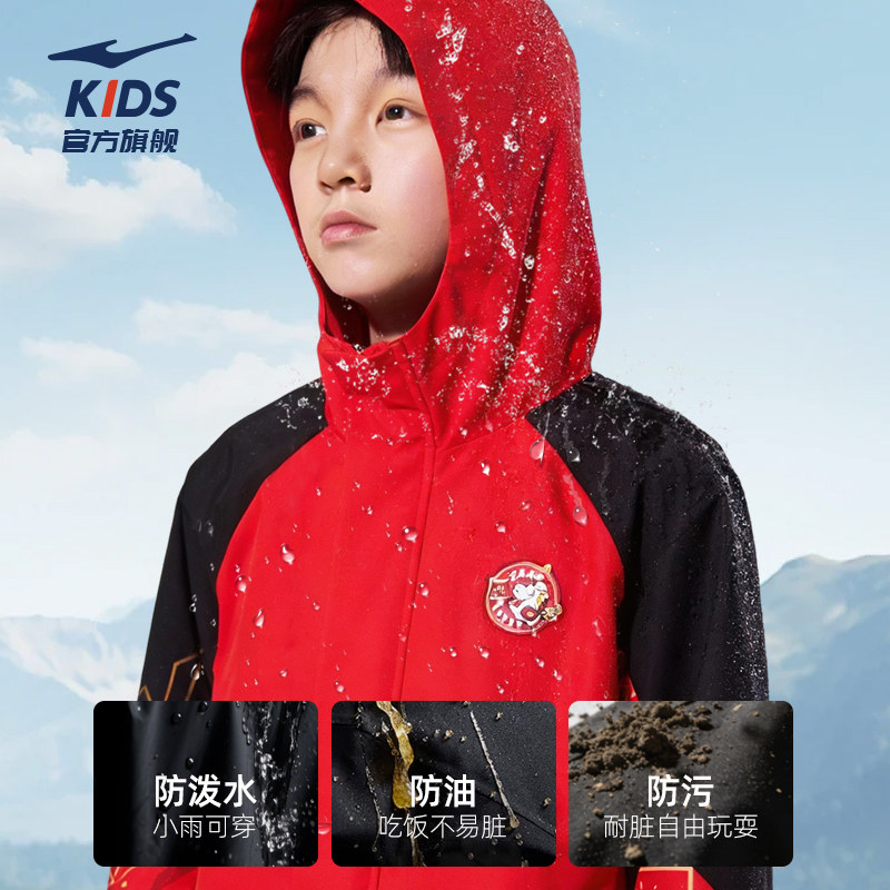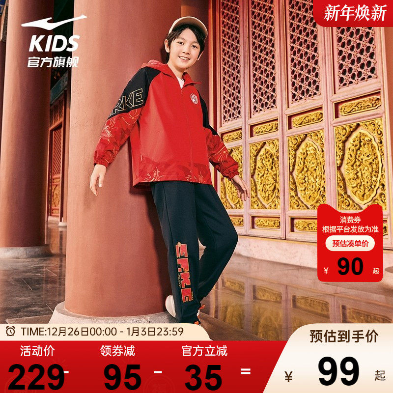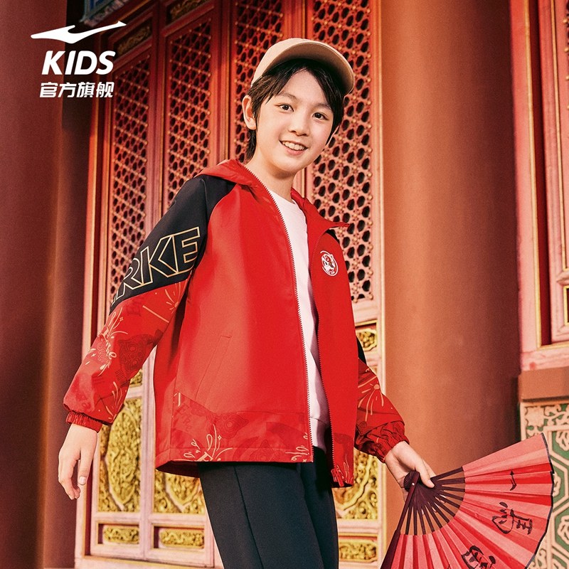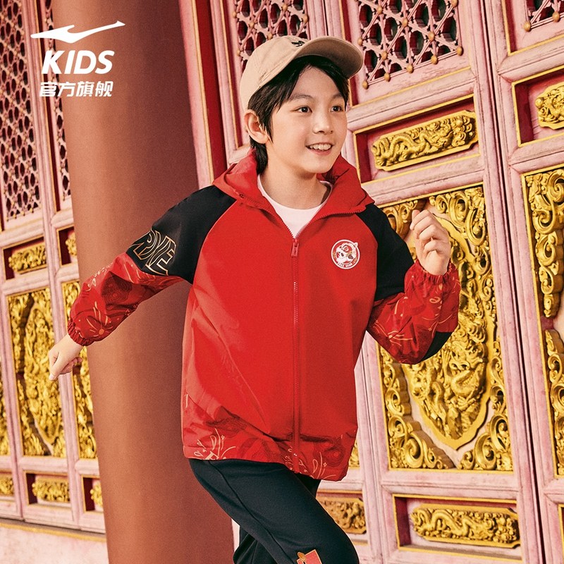 鸿星尔克童装新年红色外套儿童运动服加绒风衣秋冬款男童防风上衣