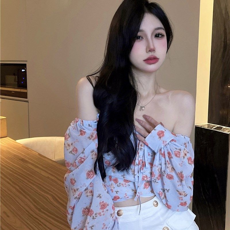 碎花露肩长袖雪纺衫女夏季新款甜美小清新气质女神范系带短款上衣