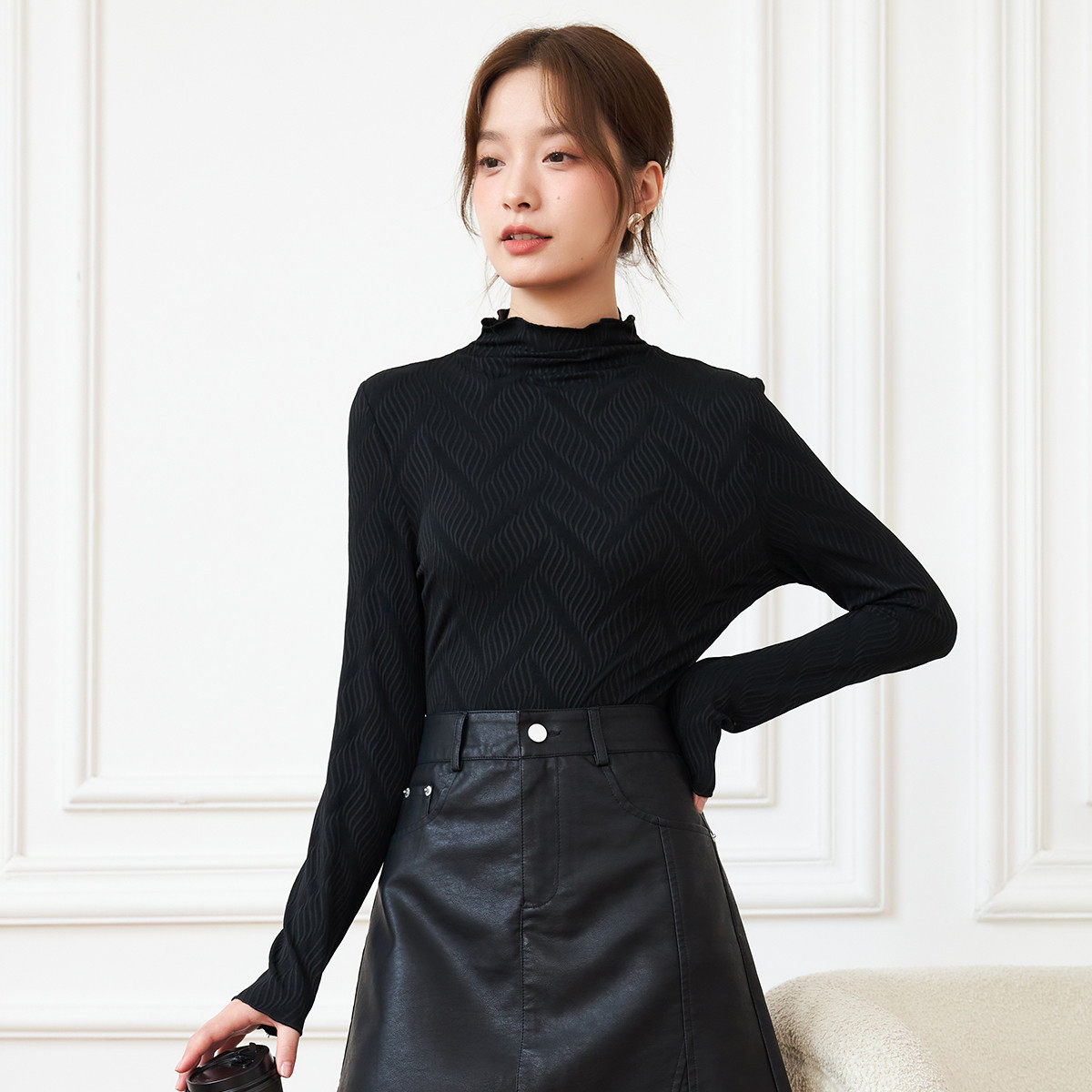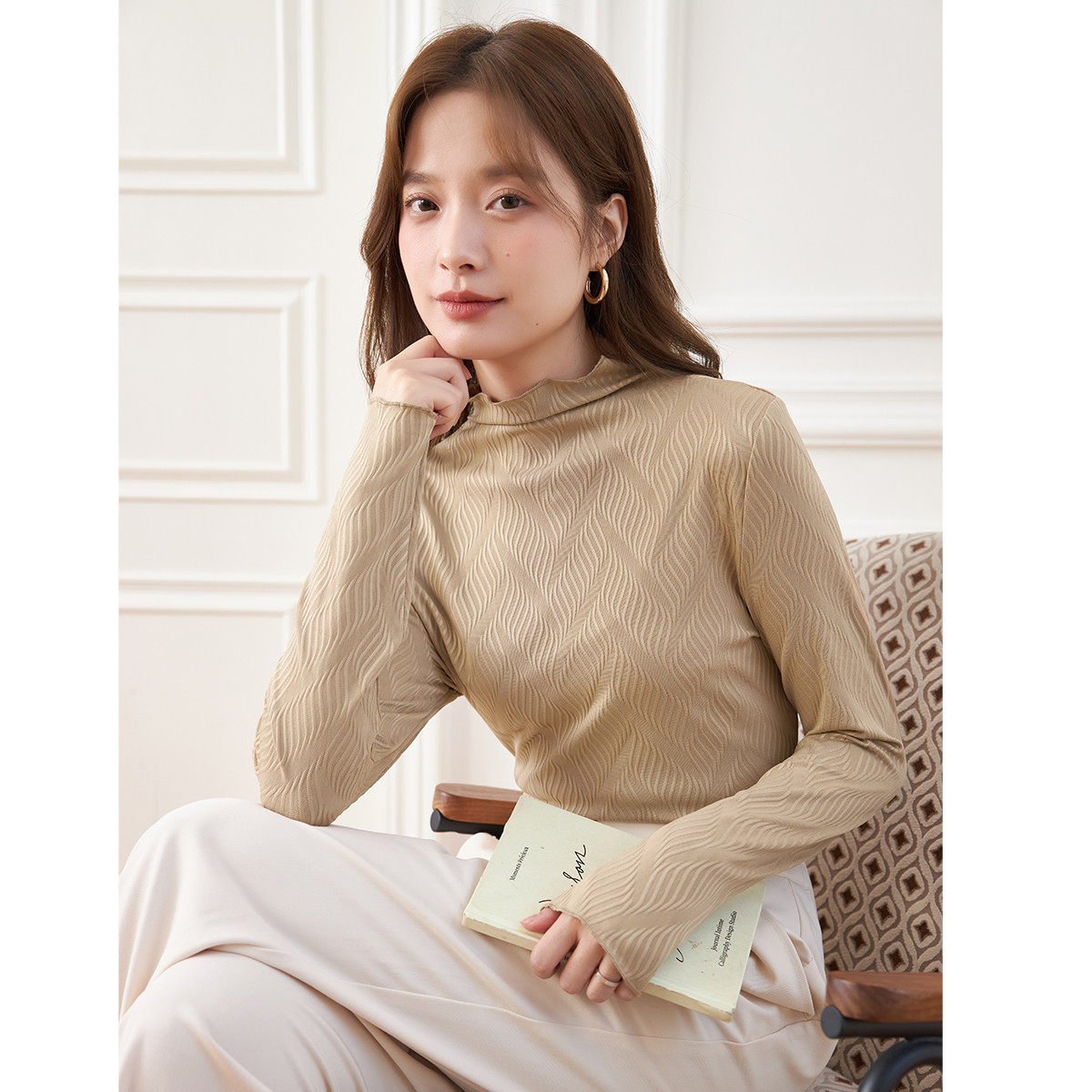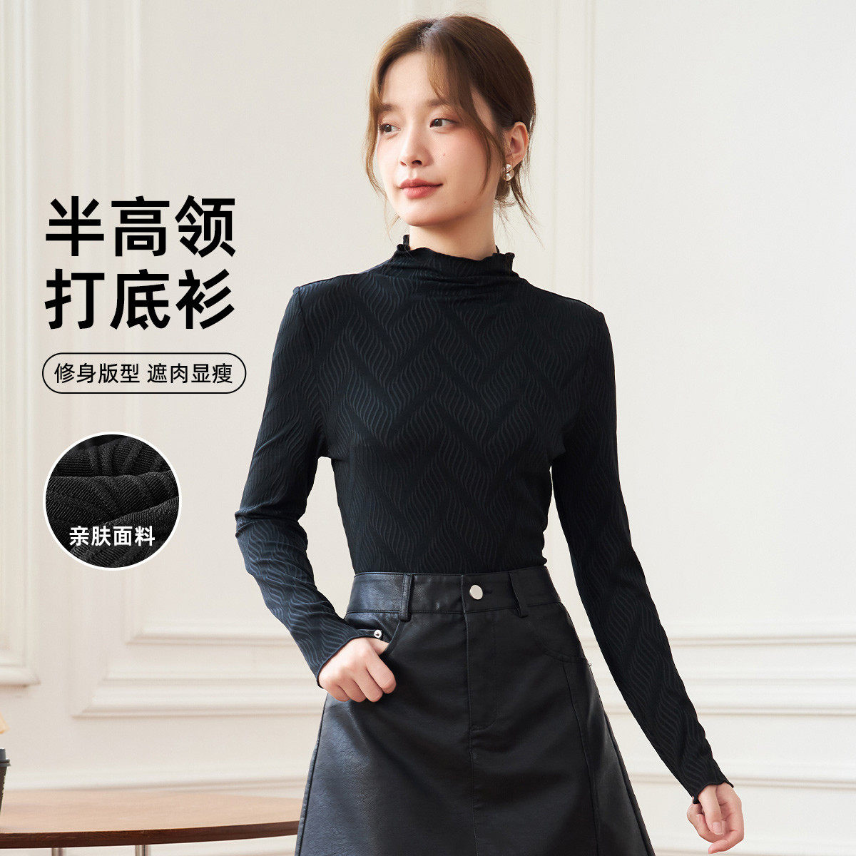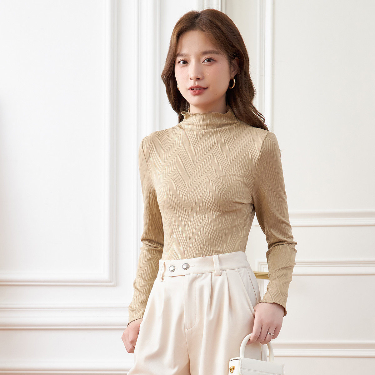 茵曼2026春季新款长袖t恤女士正肩半高领内搭打底衫爆款修身显瘦