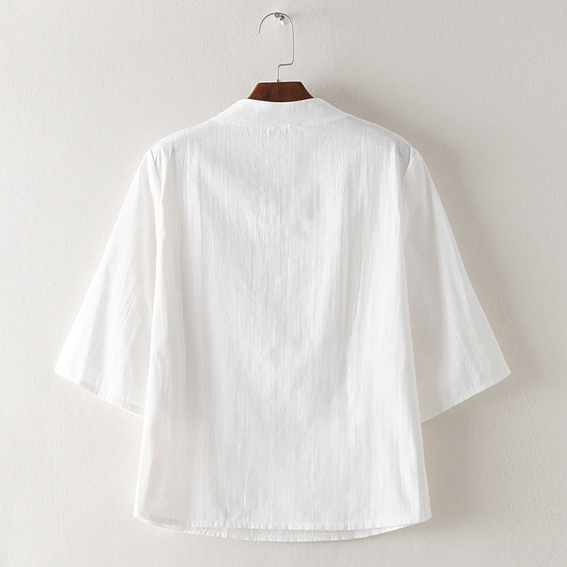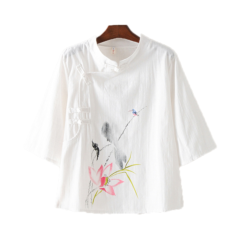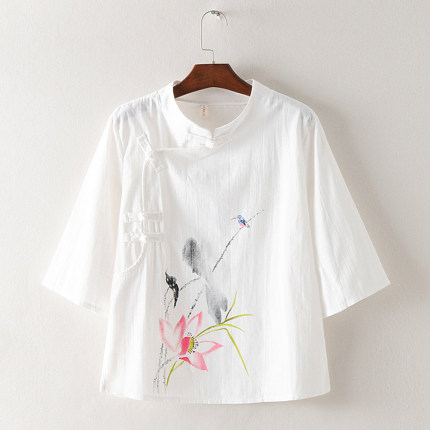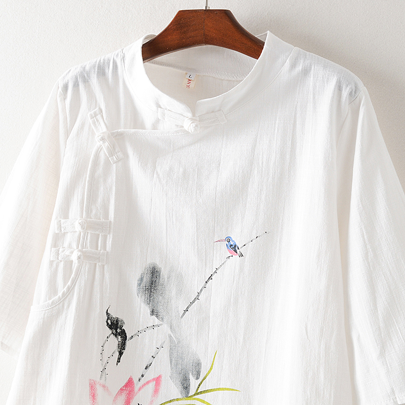 7分袖印花棉麻上衣女复古立领盘扣中国风春装t恤宽松休闲亚麻女装