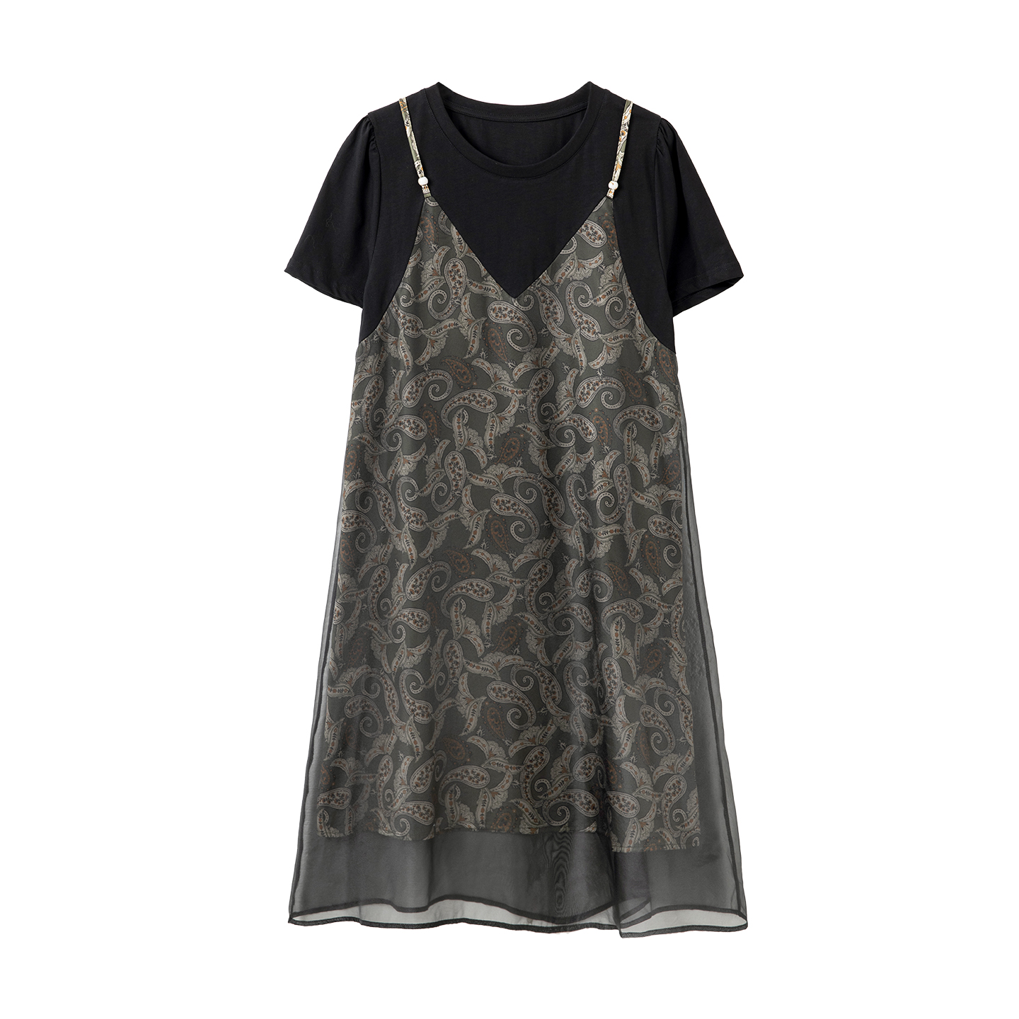 宝诗黎网纱印花拼接连衣裙2025夏季设计感假两件气质短袖休闲裙
