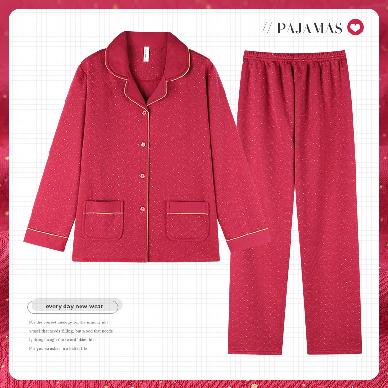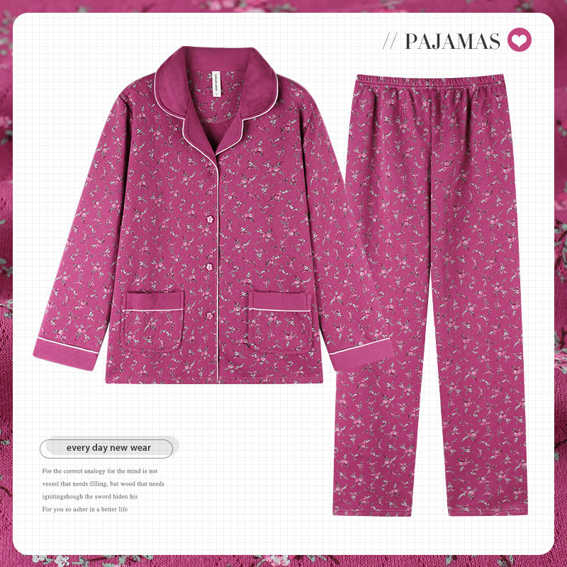 秋冬季中年人妈妈开衫夹层纯棉睡衣女士长袖加厚空气棉家居服套装