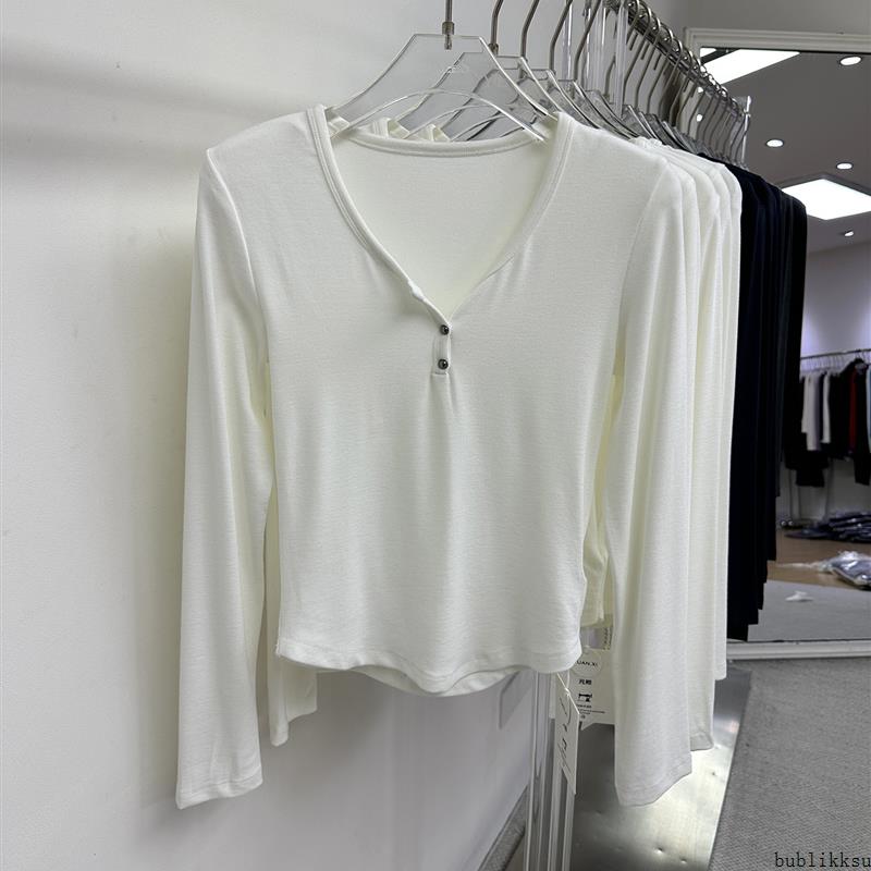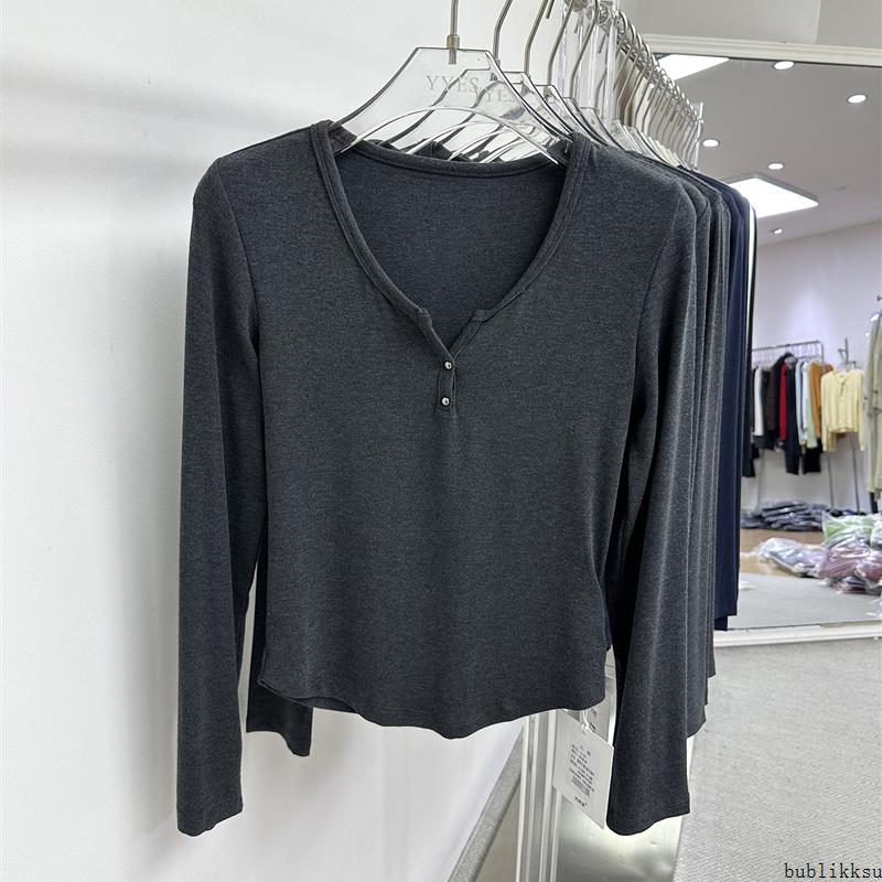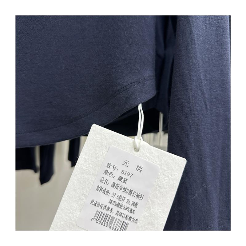 元熙慕斯羊绒秋装U领长袖T恤纽扣设计感修身打底衫上衣女6197