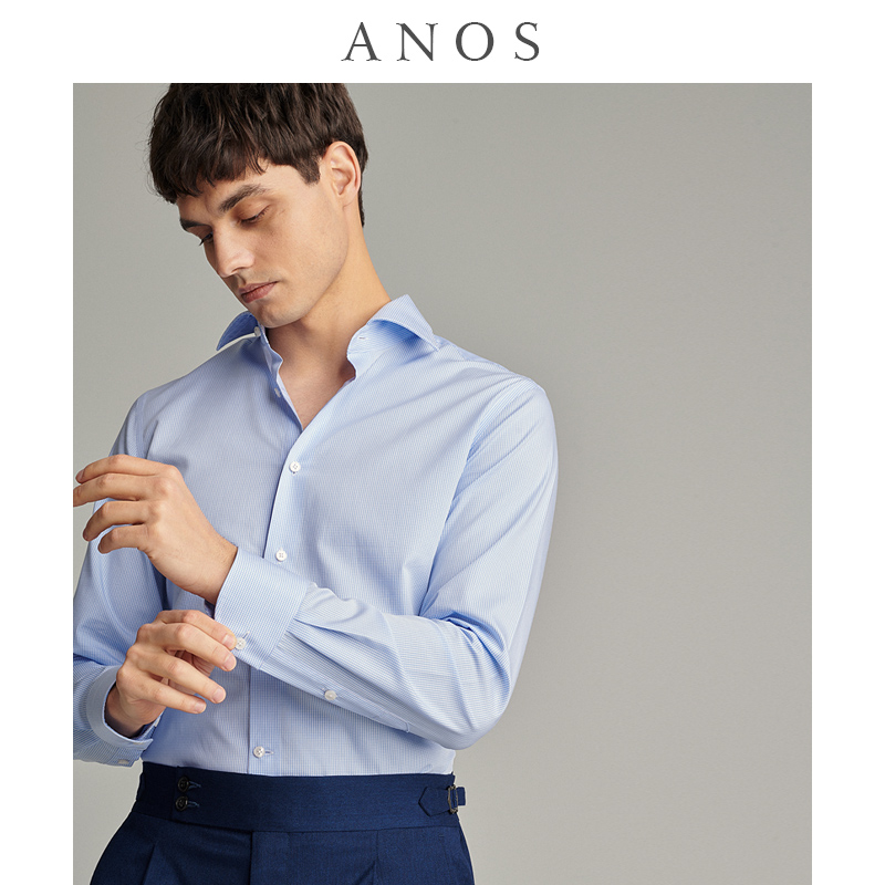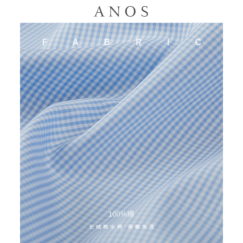 ANOS浅蓝白格纹衬衫男 意式温莎领商务修身免烫纯棉格子长袖衬衣