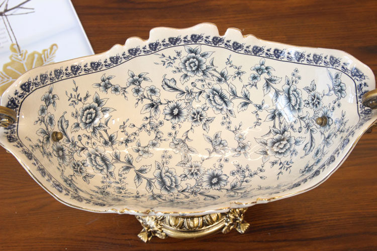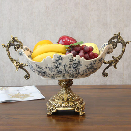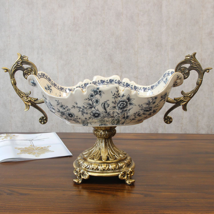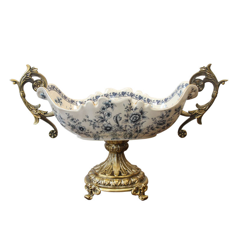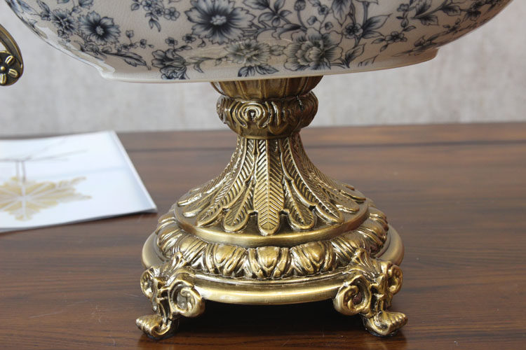美式别墅样板房工艺大果盘 欧式复古合金陶瓷水果盘 中式软装饰品