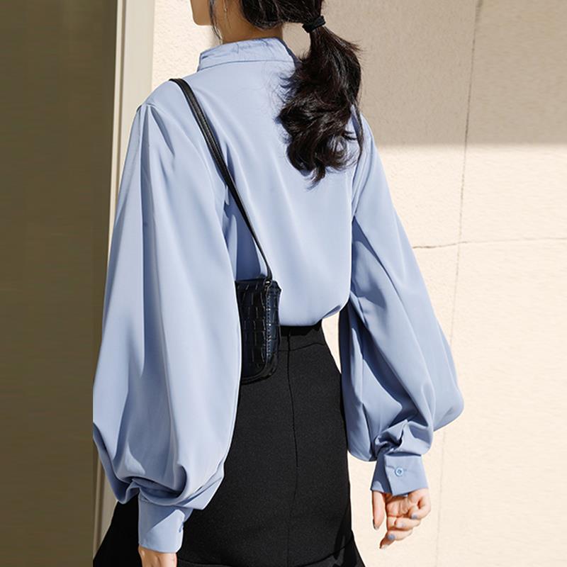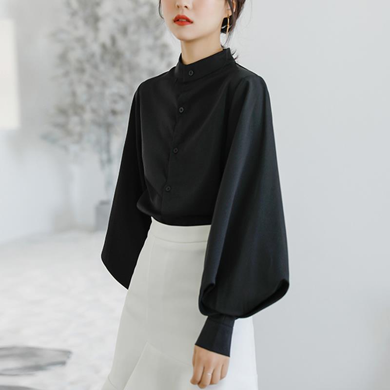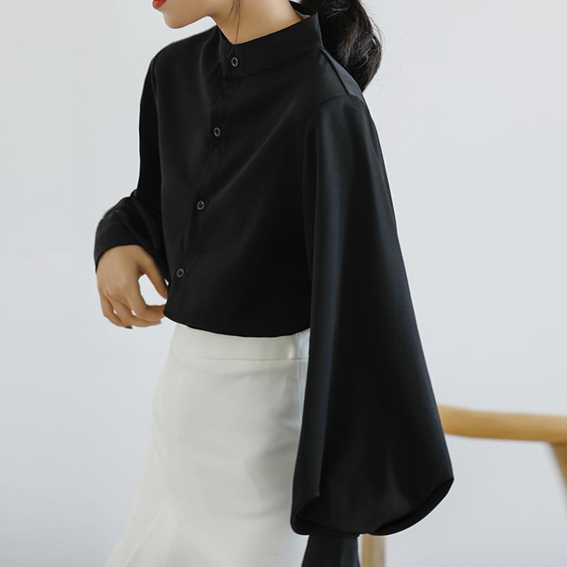 黑色衬衫女高级感2025早秋新款灯笼袖超好看立领搭马面裙衬衣上衣