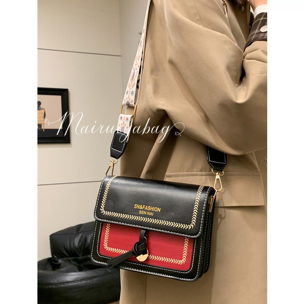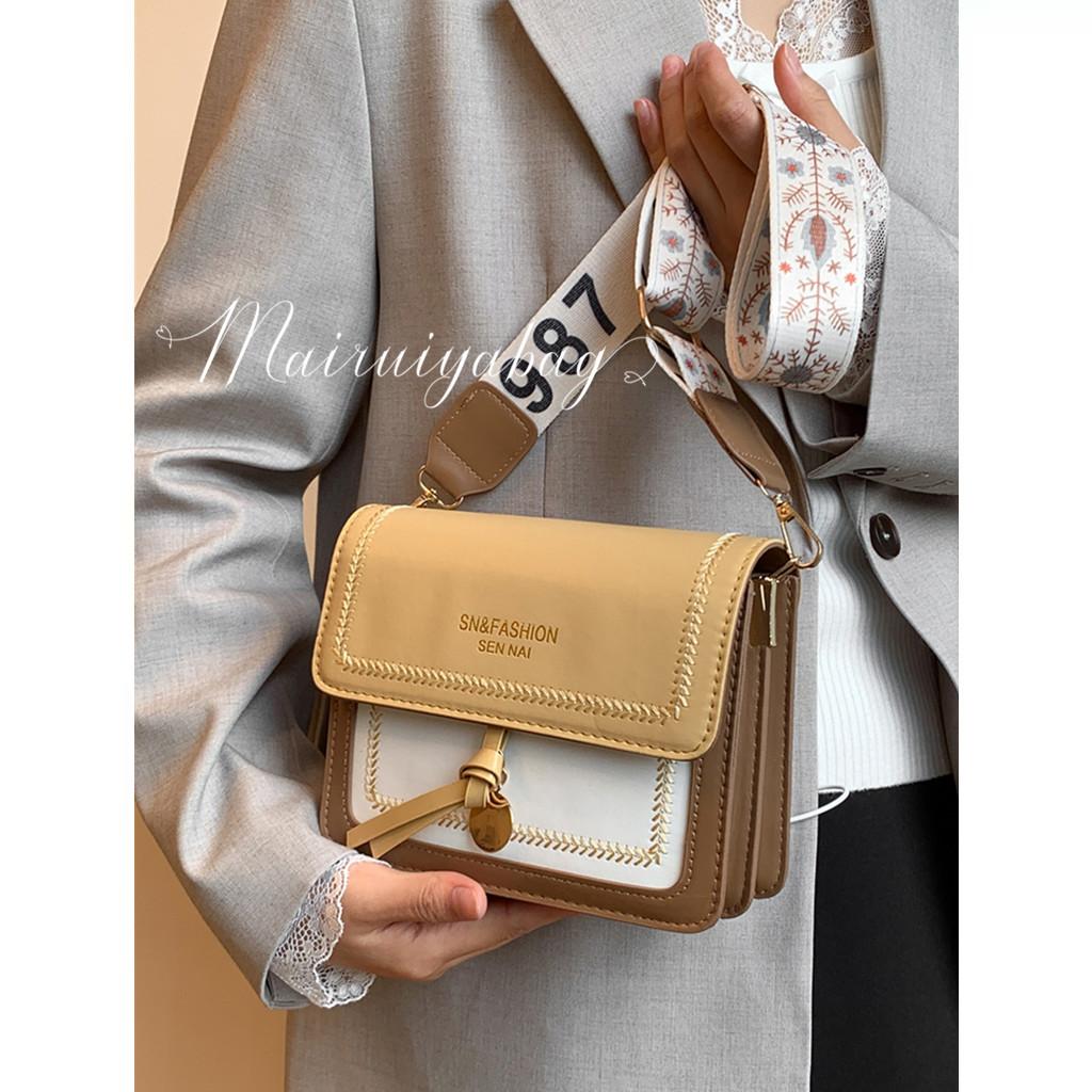 小包包女秋冬新款ins简约百搭宽肩带单肩斜挎韩版刺绣撞色小方包