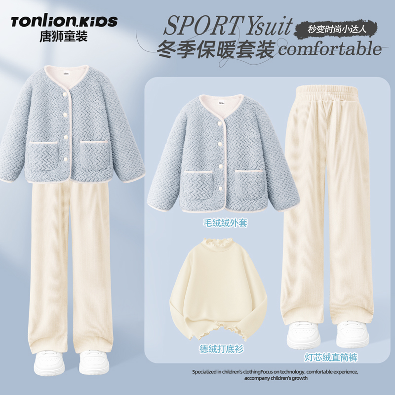 唐狮童装女童冬装套装2025新款冬季韩系毛毛外套女孩加绒牛仔裤子