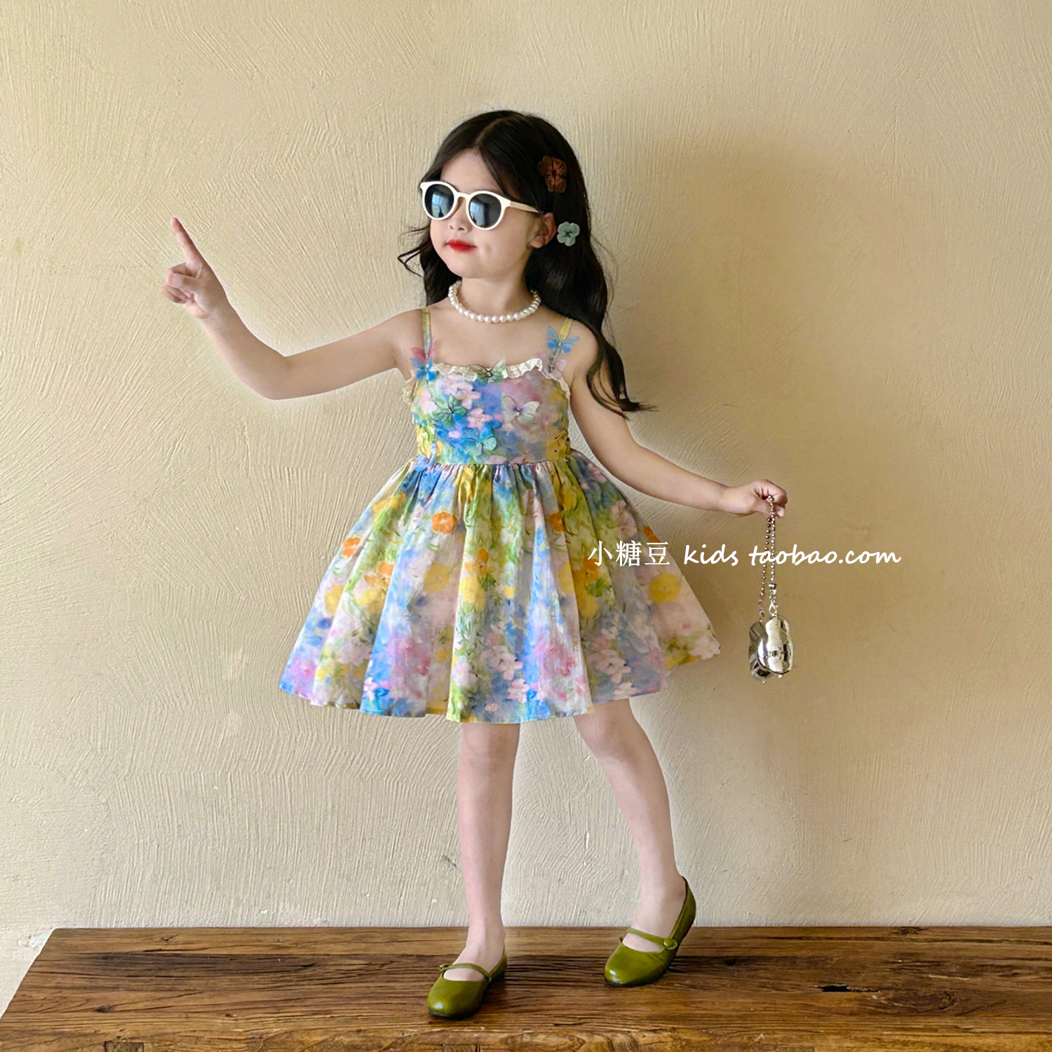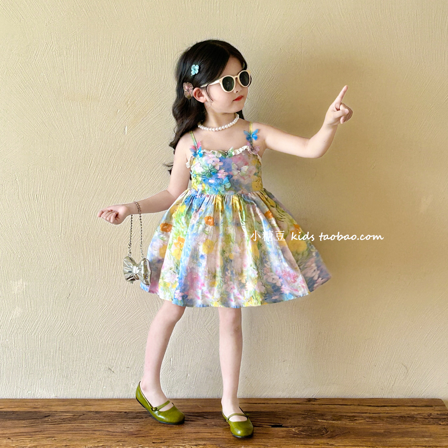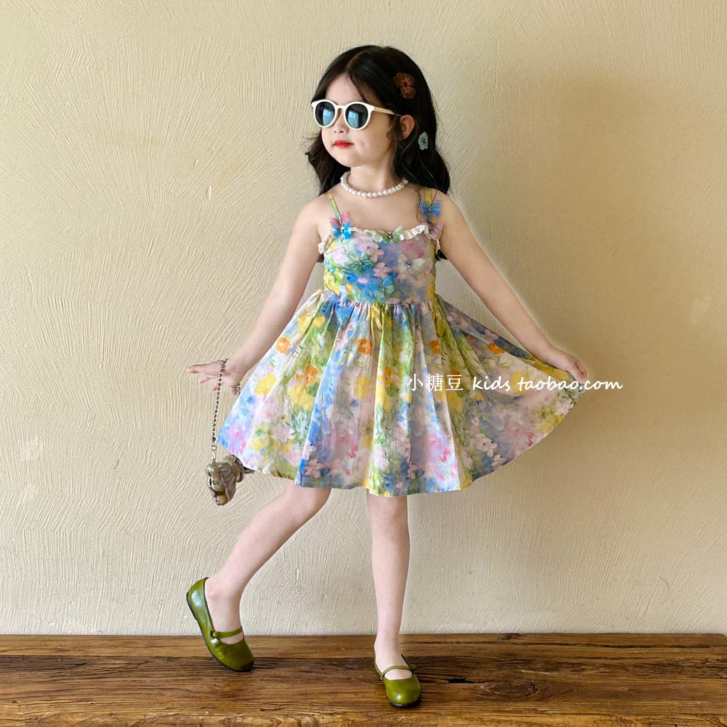 女童蝴蝶碎花吊带连衣裙
