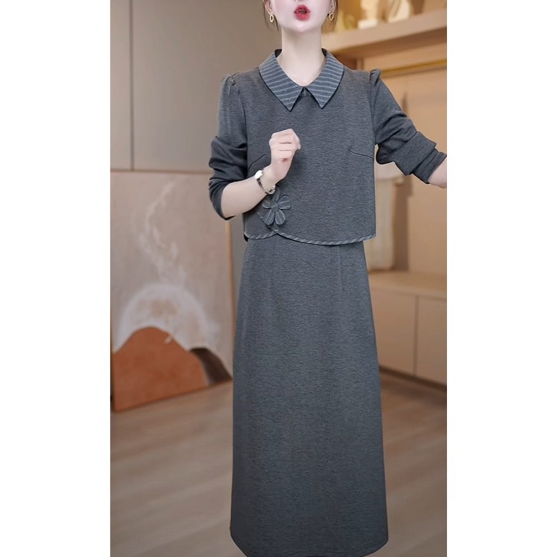 银禾娃娃领假两件连衣裙子女士春秋新款减龄洋气时尚中长过膝遮肚