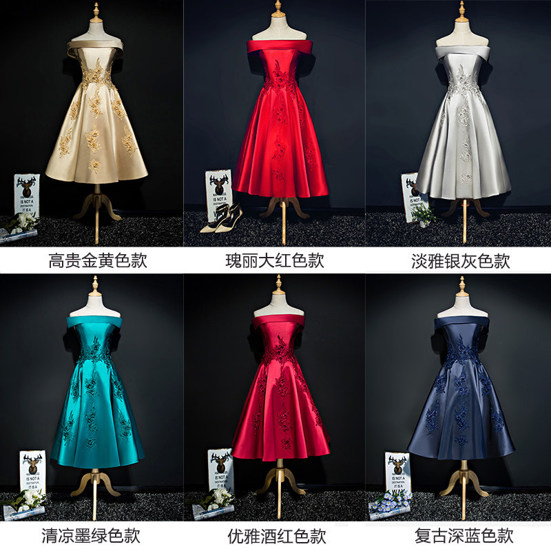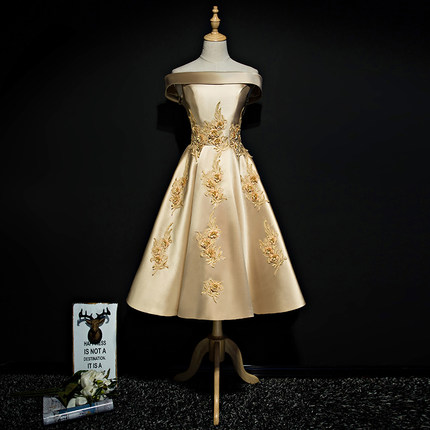洋装小晚礼服2022新款中长款金色一字肩宴会气质轻奢伴娘连衣裙女