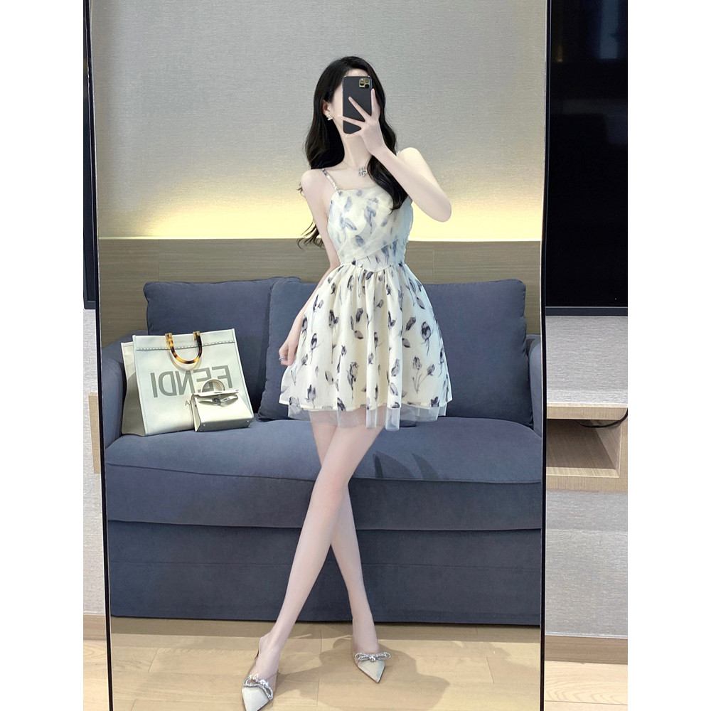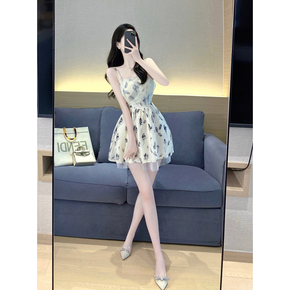 碎花吊带裙2024夏季新款法式气质名媛收腰显瘦甜美纱网a字连衣裙