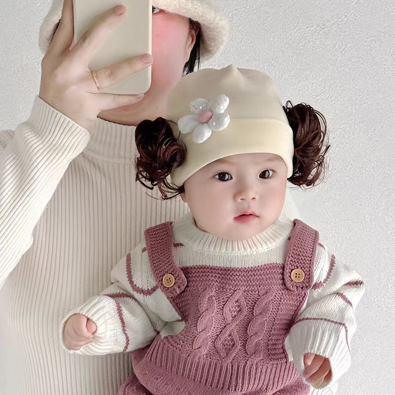 婴儿帽子秋款韩版女宝宝时尚花朵假发胎帽婴幼儿棉质护囟门套头帽