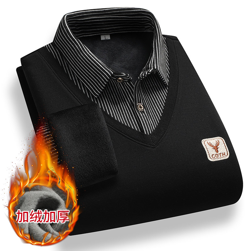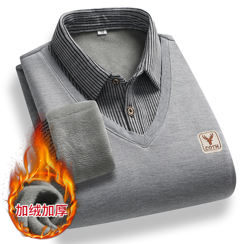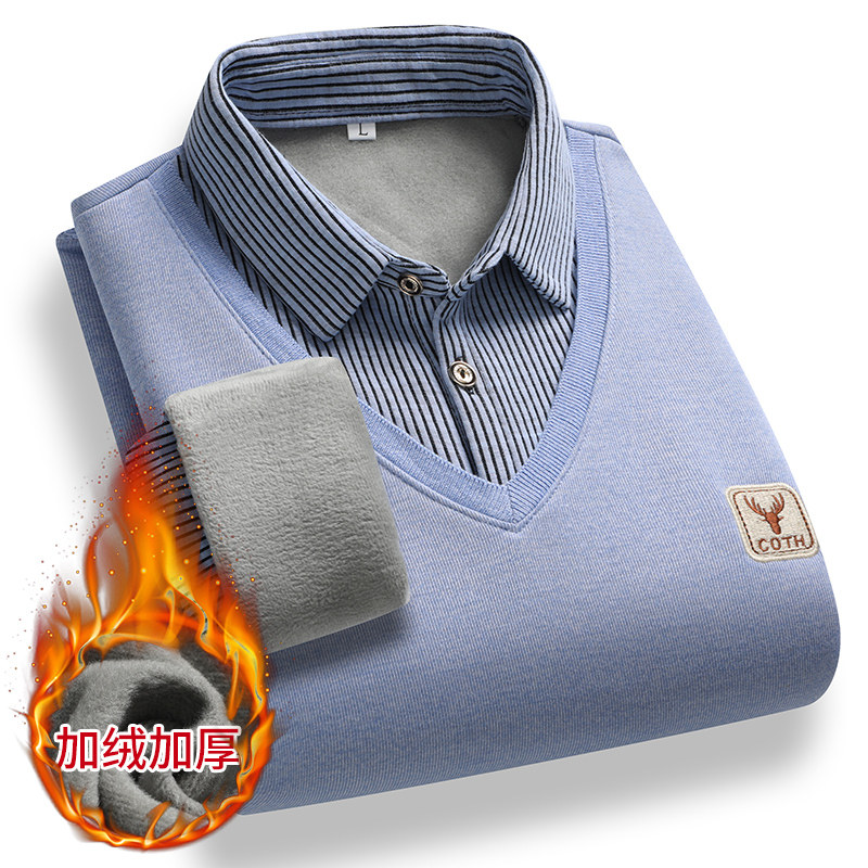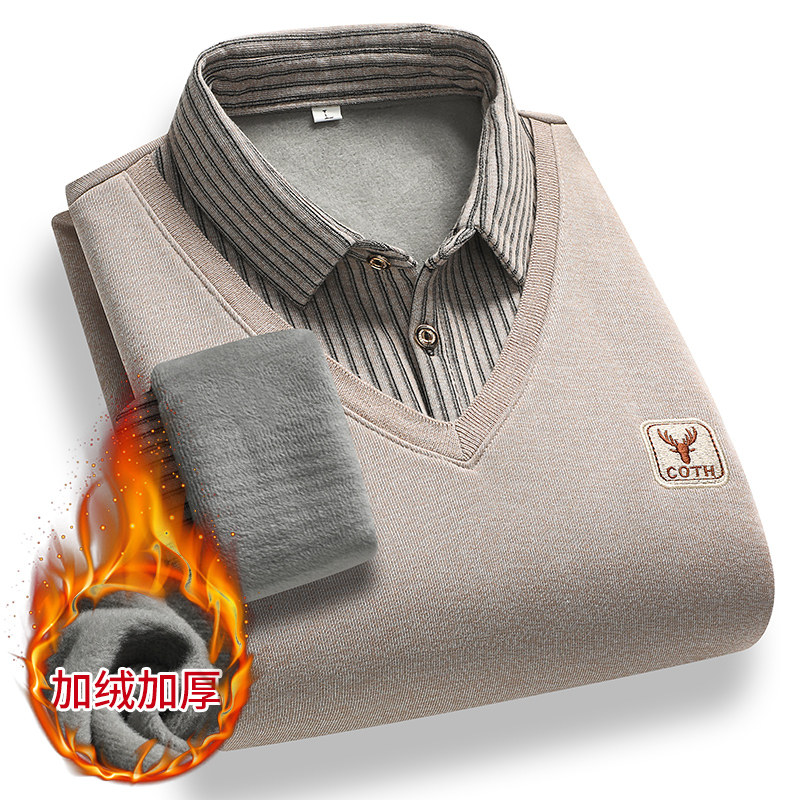 秋冬季保暖男士针织衫假两件毛衣长袖衬衫中老年人加绒加厚爸爸装