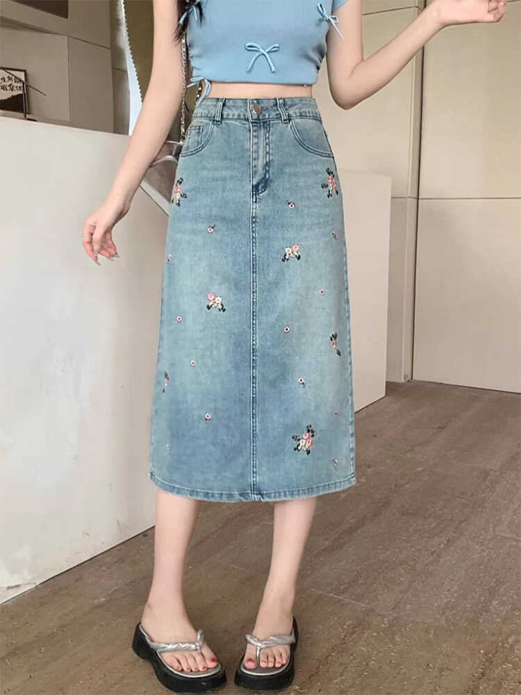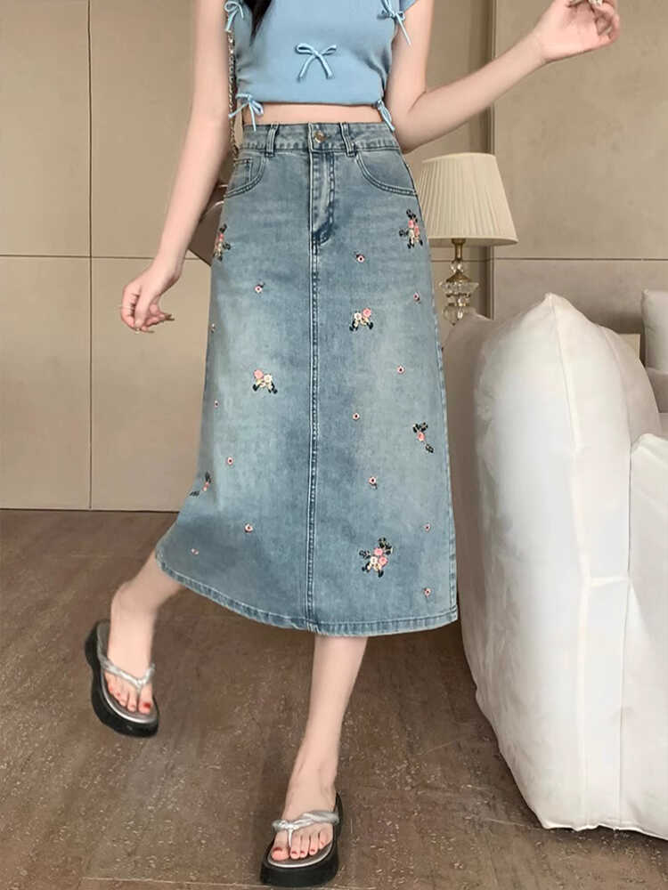 夏季新款2-300斤碎花刺绣牛仔半身裙女胖mm大码高腰开叉a字半裙潮