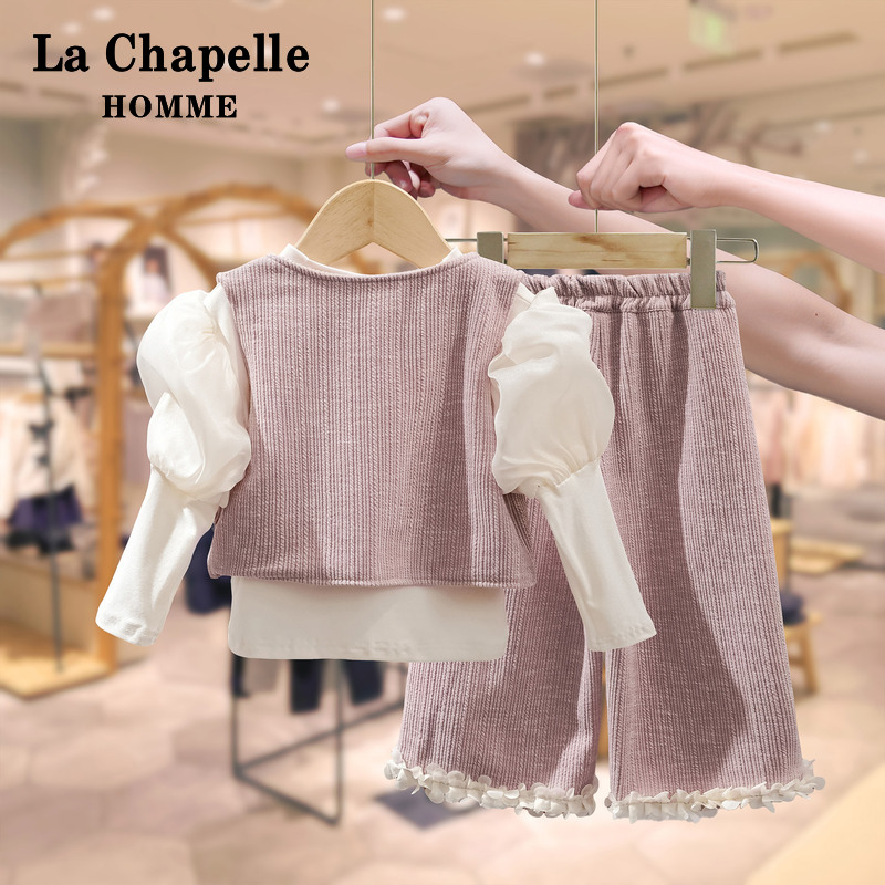 拉夏贝尔女童秋季套装2025新款儿童宝宝小香风马甲裤子春秋三件套
