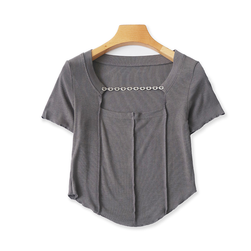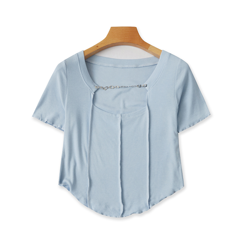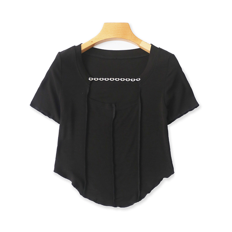 圆领针织弹力T恤衫 夏季新款短袖薄款拼接打底衫 女外贸上衣06504