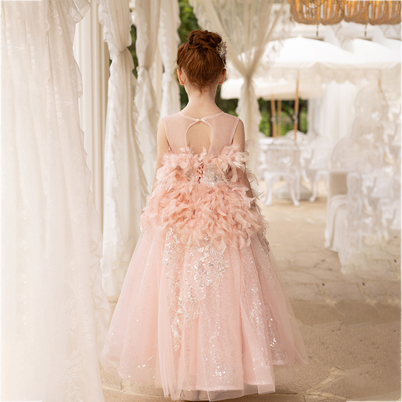 女童礼服粉色羽毛洋气公主裙唱歌主持生日宴会花童走秀钢琴演出服