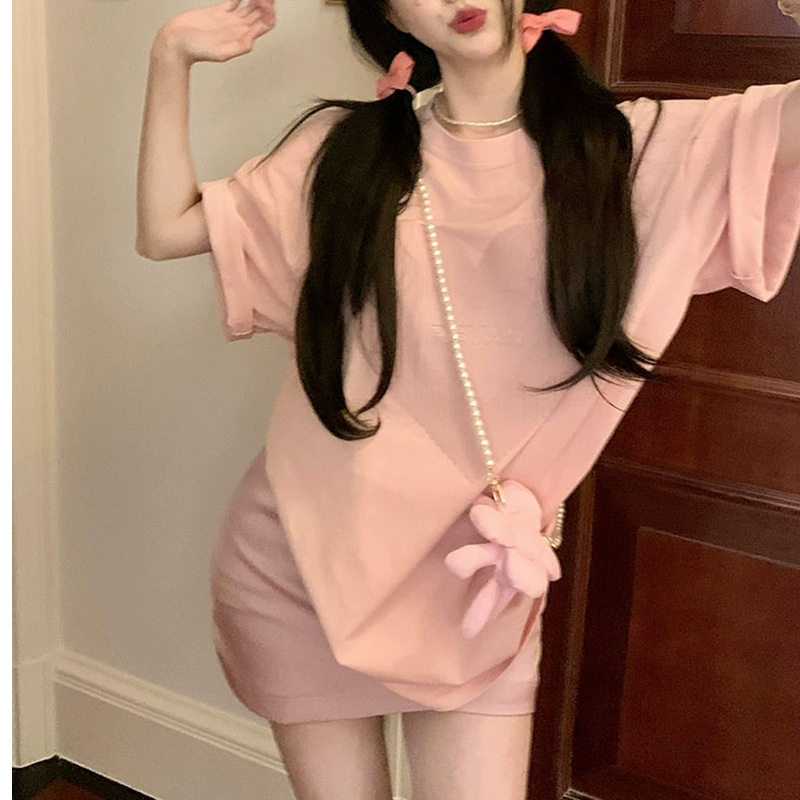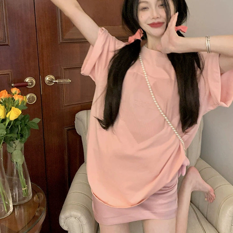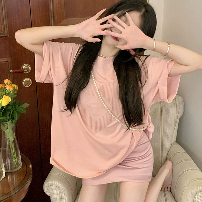 粉色减龄韩版爱心印花短袖T恤女2026新款夏季宽松中长款慵懒上衣