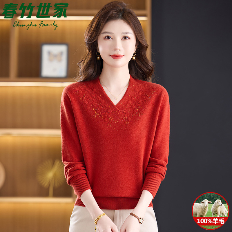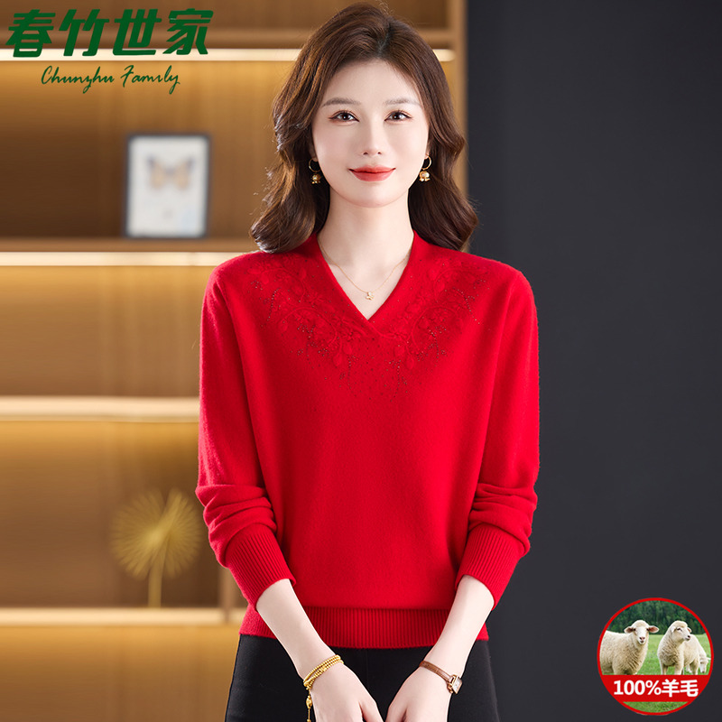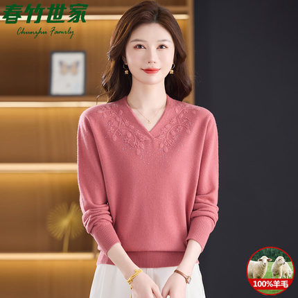 春竹世家100%纯羊毛衫女秋冬V领绣花毛衣宽松洋气妈妈针织打底衫