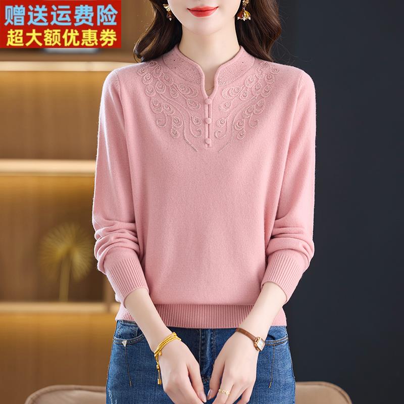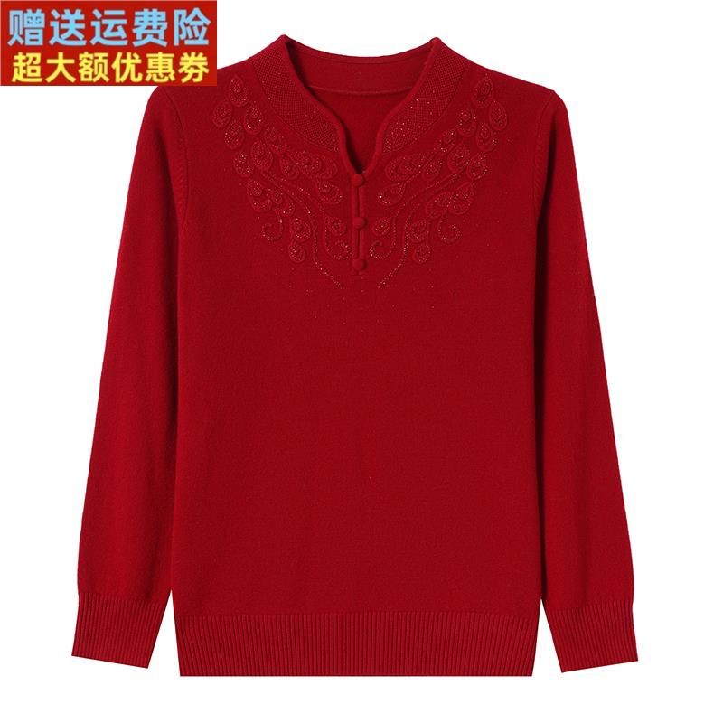 新款100%纯羊绒衫女秋冬毛衣时尚宽松减龄高端镶钻妈妈打底衫上衣