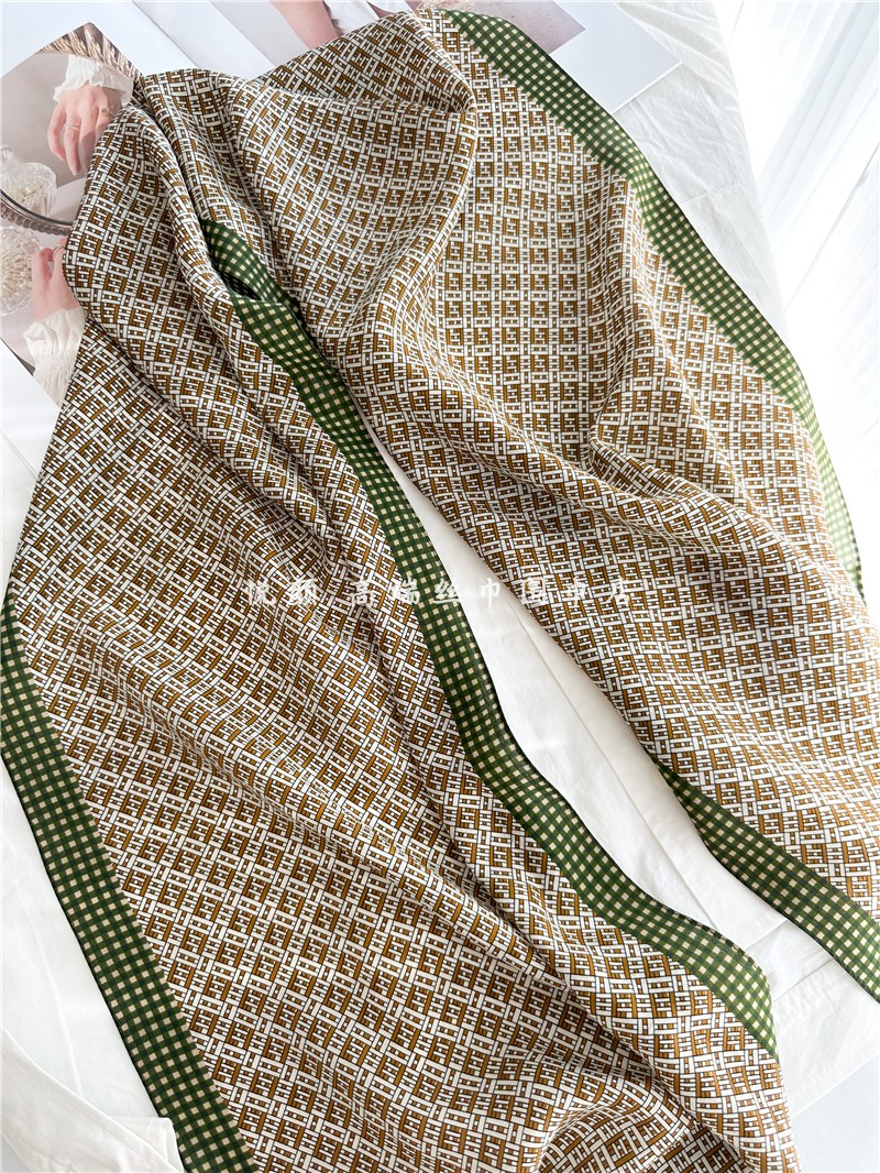 高档苍翠绿色杭州真丝丝巾女格纹长条双绉桑蚕丝围巾飘带百搭新款