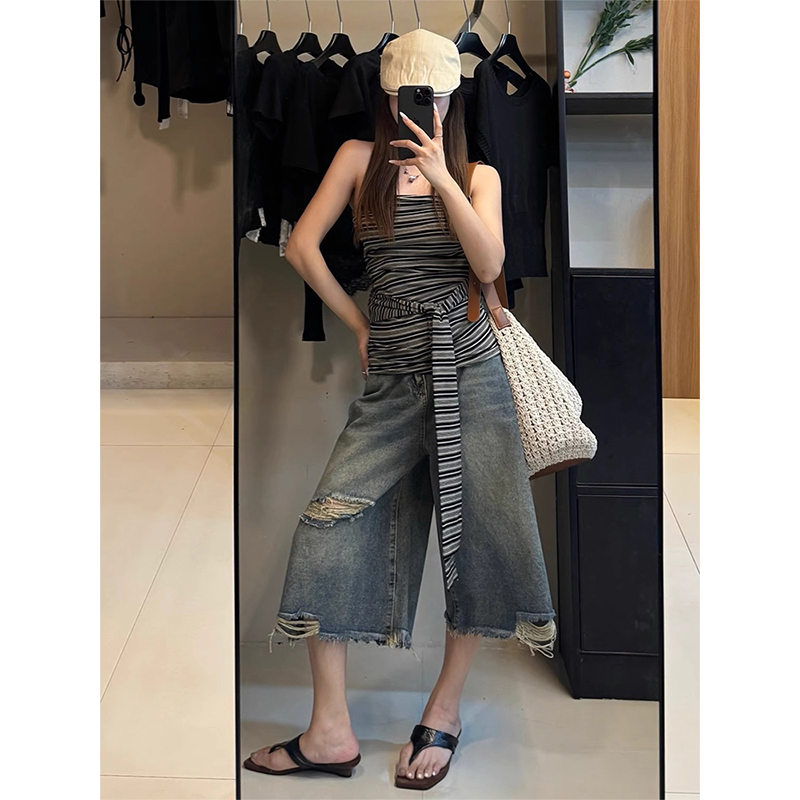 大码小个子复古破洞七分牛仔短裤女秋冬新款高腰宽松阔腿直筒裤子