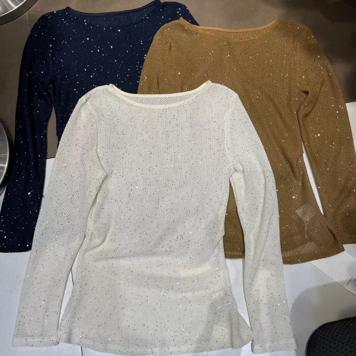 欧洲站2025秋季新款重工亮片一字领薄款长袖针织衫上衣打底衫上衣