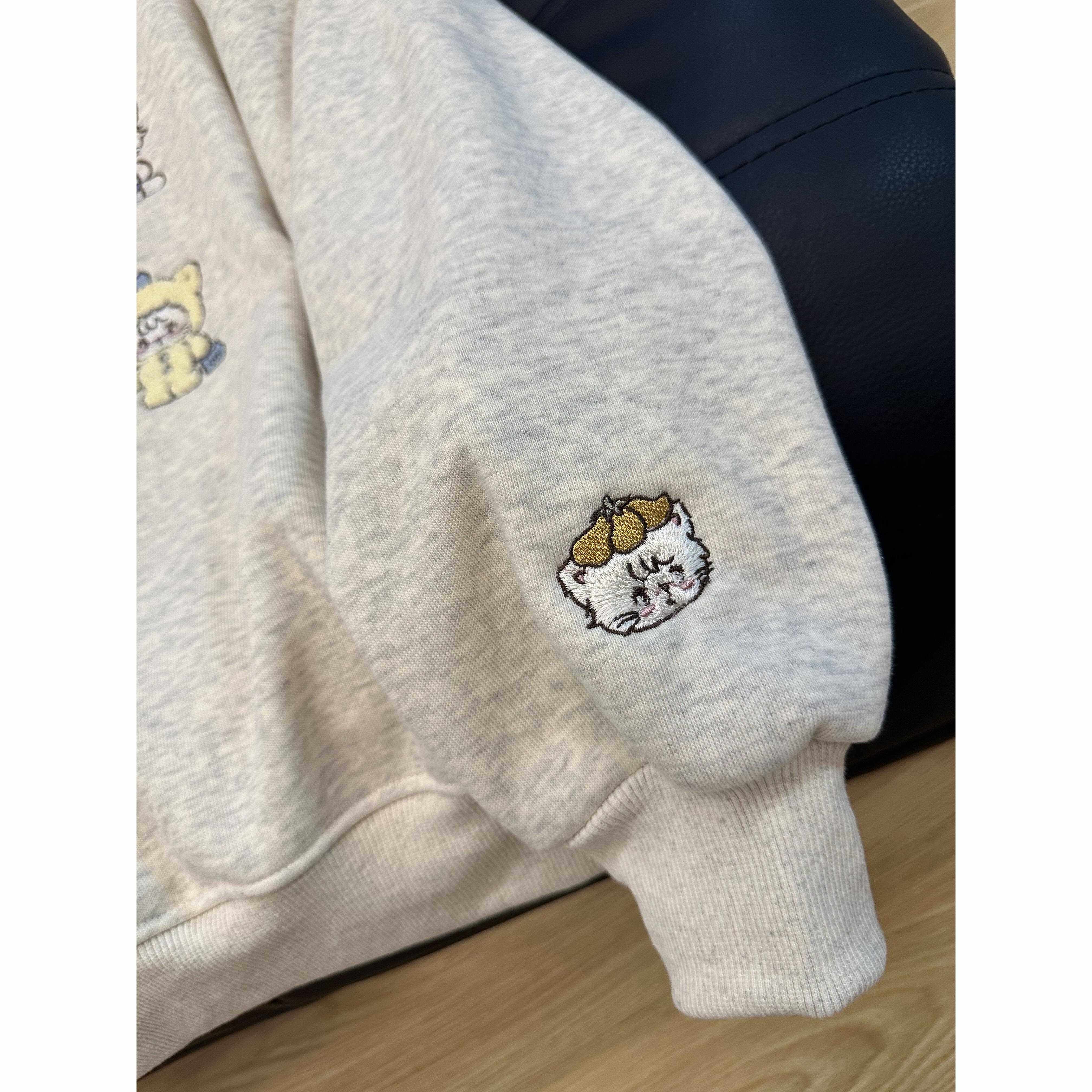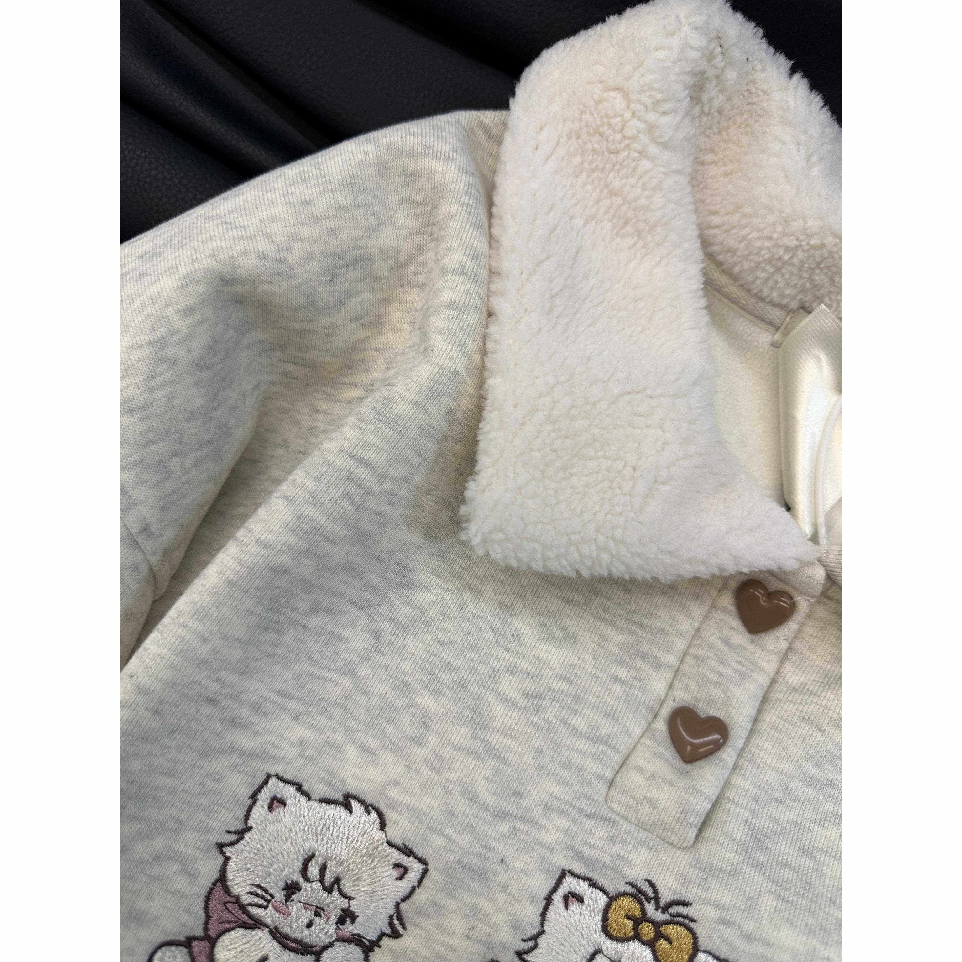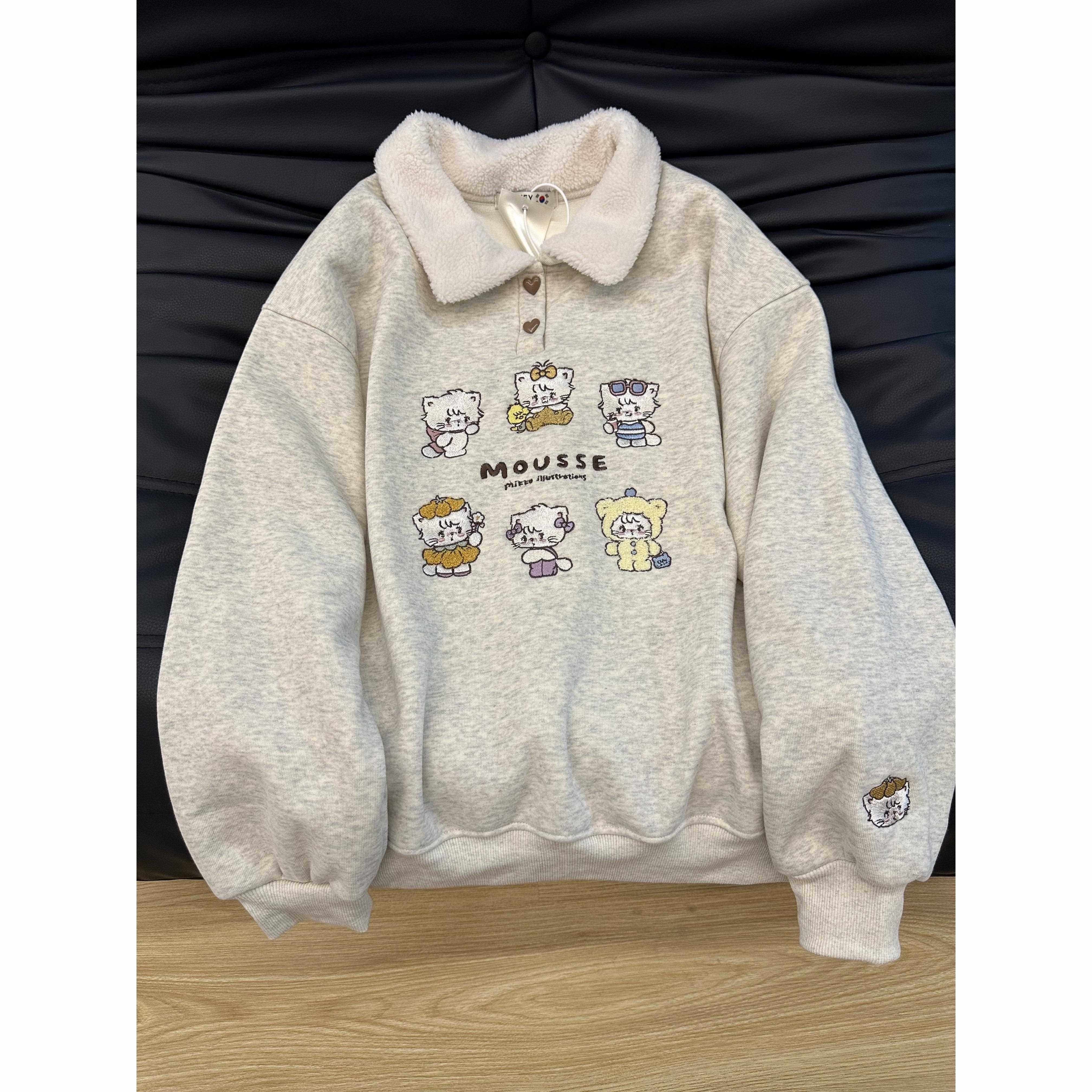 韩系小众设计款加绒加厚卫衣女猫咪刺绣宽松减龄polo领保暖上衣潮