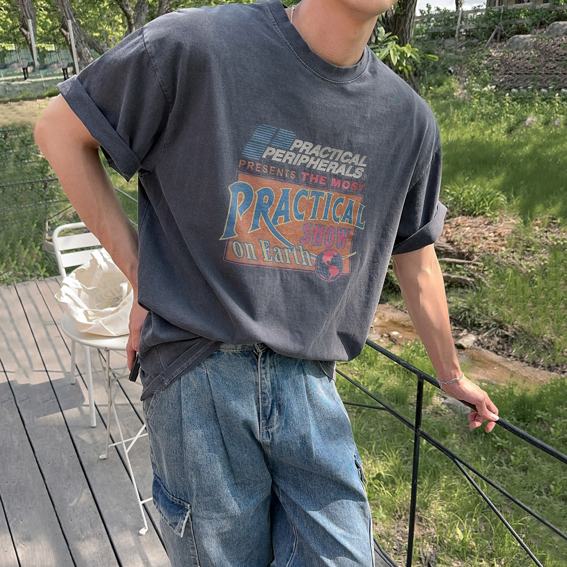 MRCYC复古水洗印花短袖T恤男士夏季宽松圆领半袖韩系通勤情侣上衣