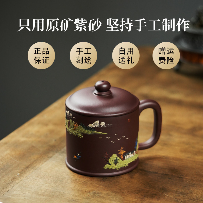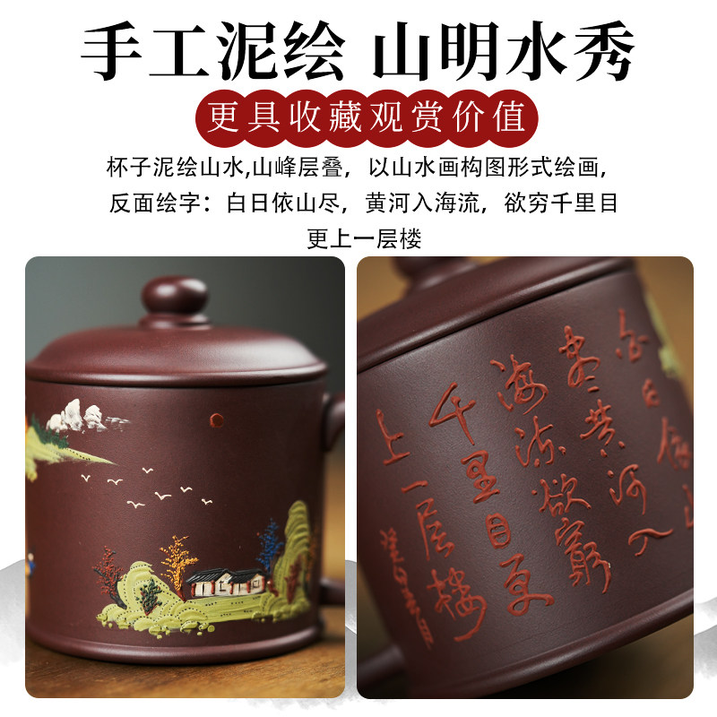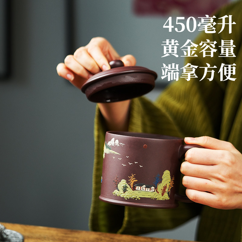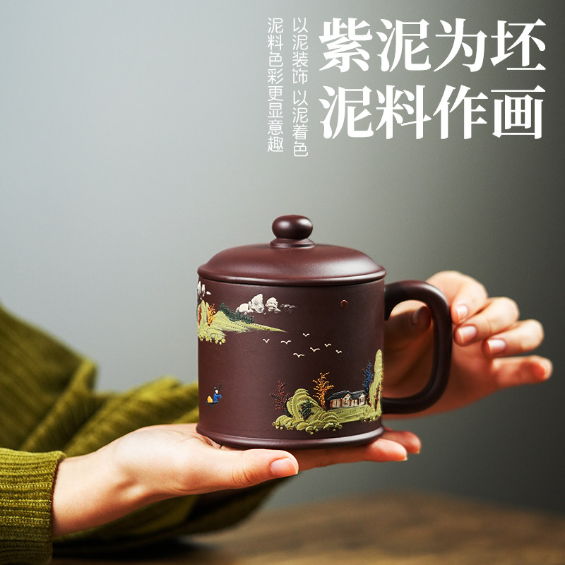 宜兴大容量粉浆泥绘山水紫砂杯男办公高端手工盖杯茶杯山明水秀