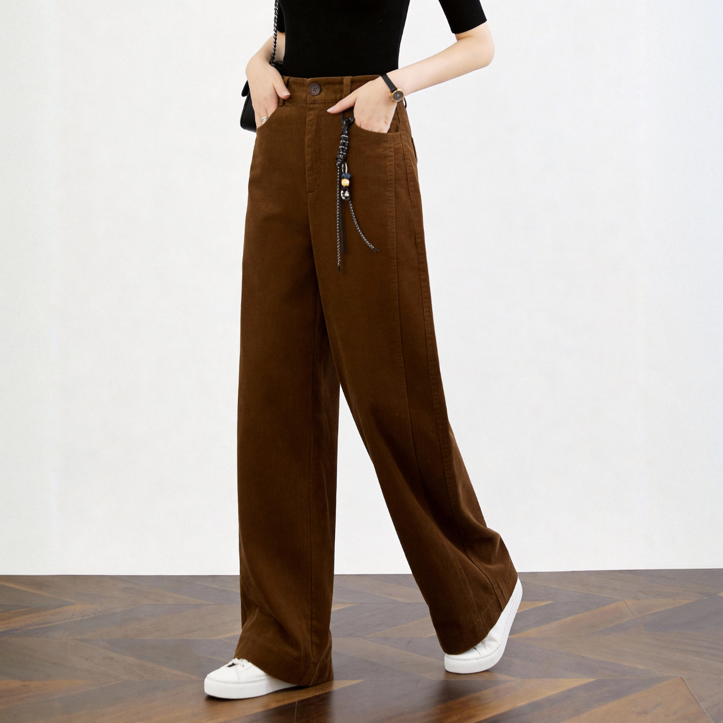 Basic House/百家好复古灯芯绒阔腿裤特色链条挂饰休闲显瘦女长裤