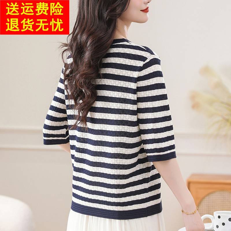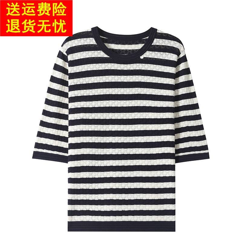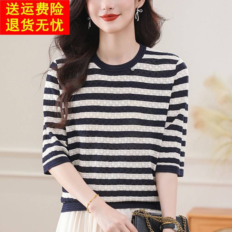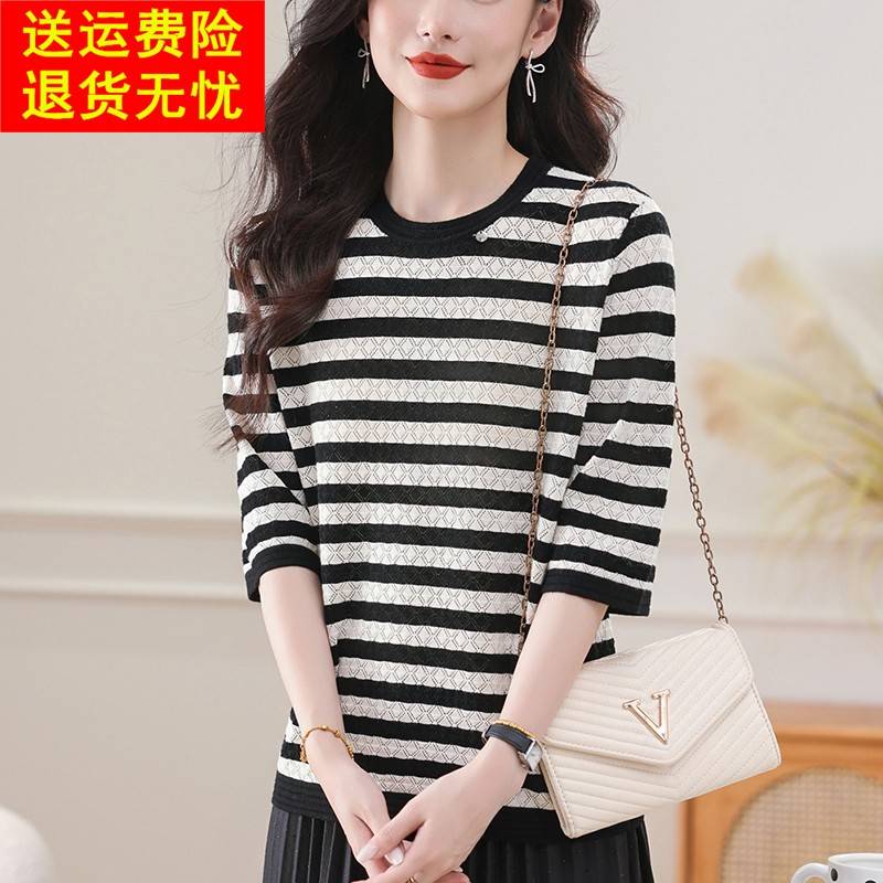 妈妈秋装桑蚕丝中袖T恤女宽松大尺码七分袖条纹针织衫洋派打底上