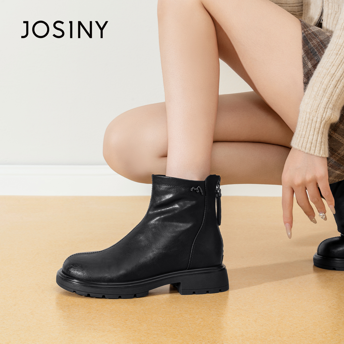 Josiny/卓诗尼25冬季新款粗跟小短靴厚底切尔西靴女软皮女鞋靴子