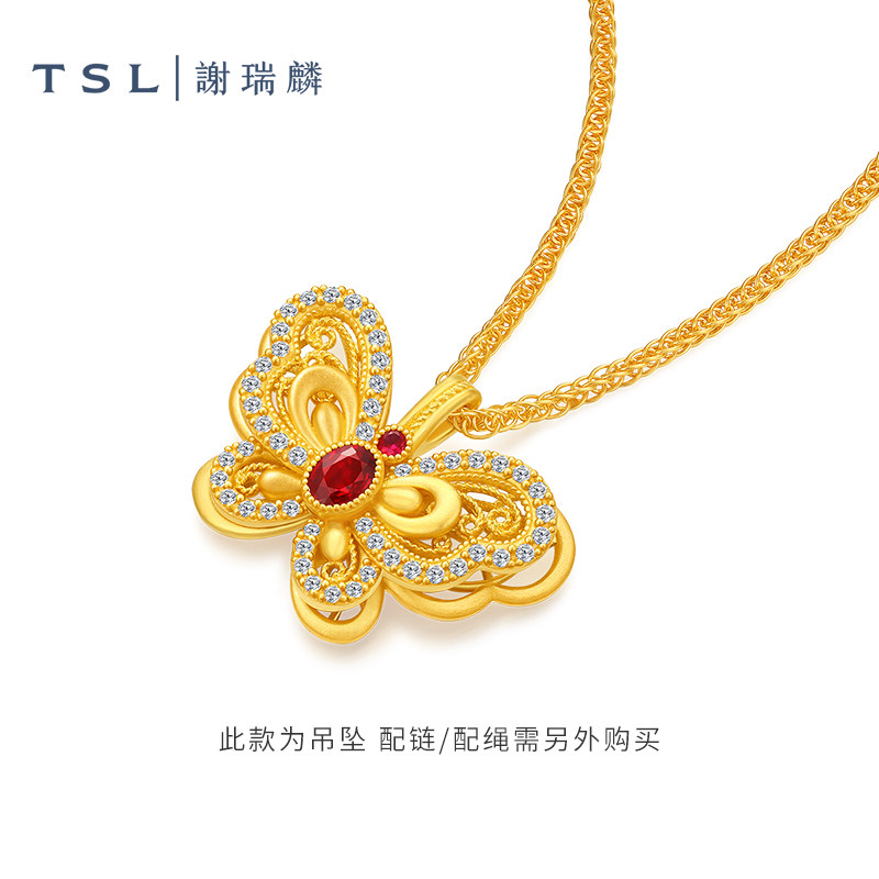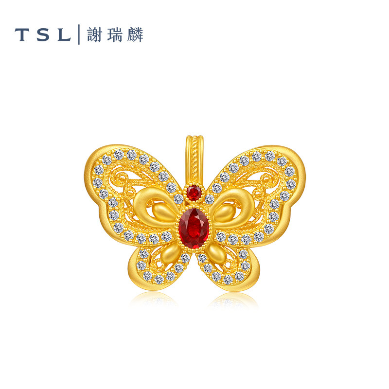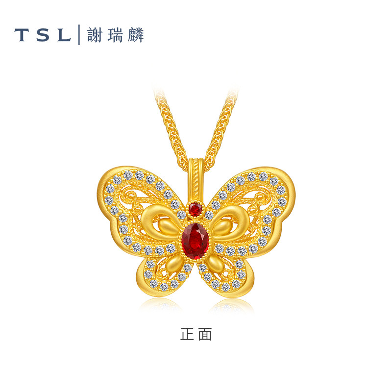 TSL谢瑞麟璀璨金钻系列黄金蝴蝶吊坠古法金红宝石钻石挂坠XQ968