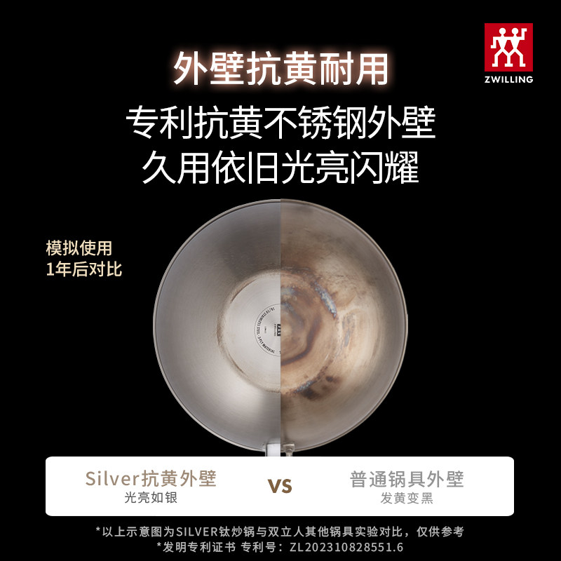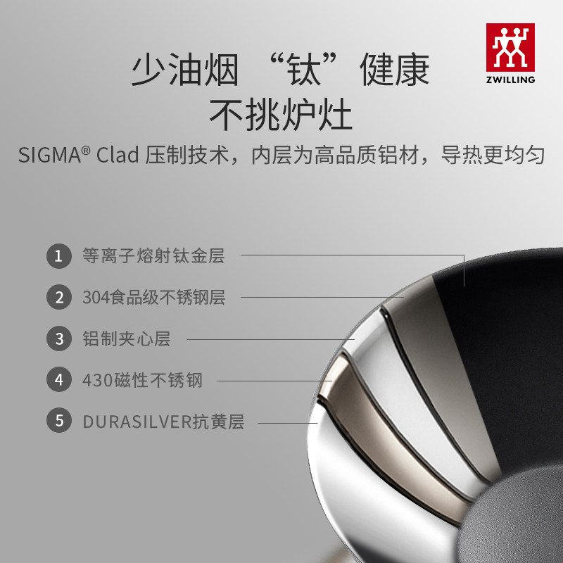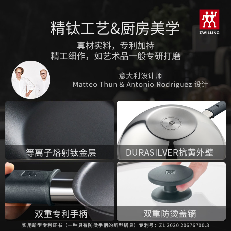 双立人钛炒锅无涂层不易粘家用炒锅30cm大口径Silver银光钛炒锅